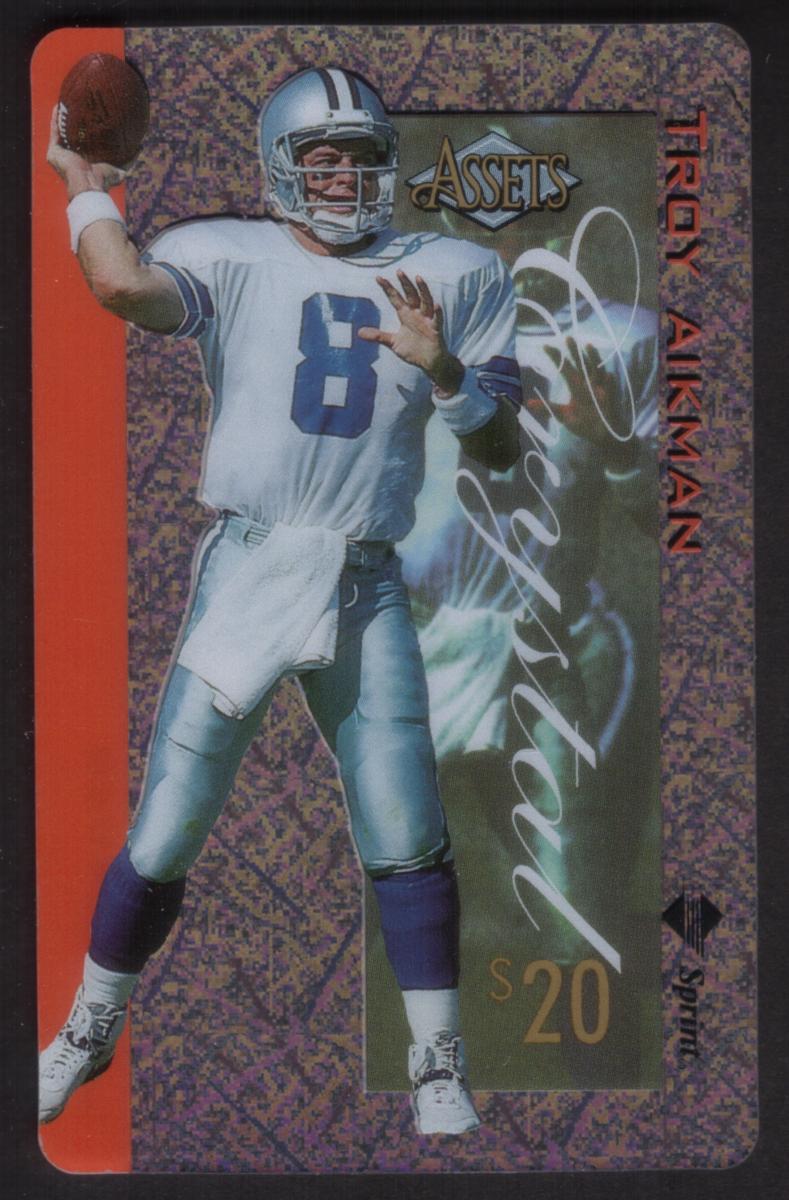 This collectible card features Troy Aikman, a well-known football player in the National Football League (NFL). The card is numbered 1 out of a set of 10 and is part of the "Assets '96" series. It is issued by The Score Board Inc. and is labeled "Crystal Clear." The front of the card showcases an image of Troy Aikman along with football-related graphics consistent with NFL branding. The card prominently displays the NFL and National Football League logos, highlighting its official licensing and sports theme.