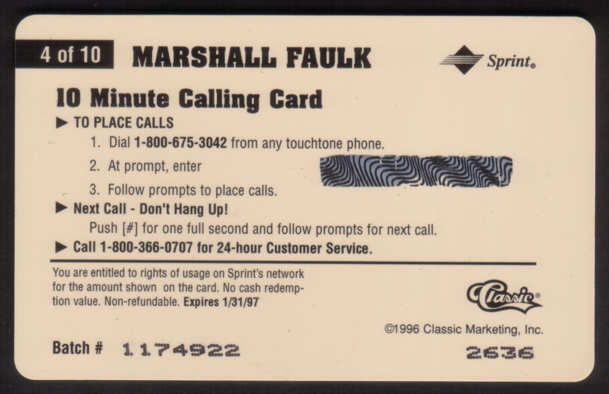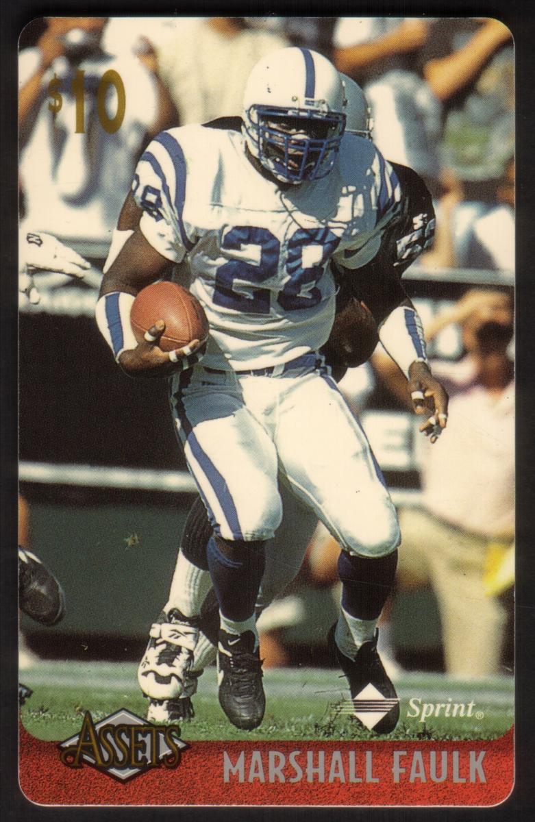 The card is from the Assets '96 series by The Score Board Inc. It has a $10 value printed in gold in the top left corner. The bottom left of the card includes the Assets logo, and along the bottom edge, Marshall Faulk’s name is printed in white text on a red background strip. The Sprint logo is located to the right of Faulk’s name on the bottom of the card. This card is part four of ten in the series.