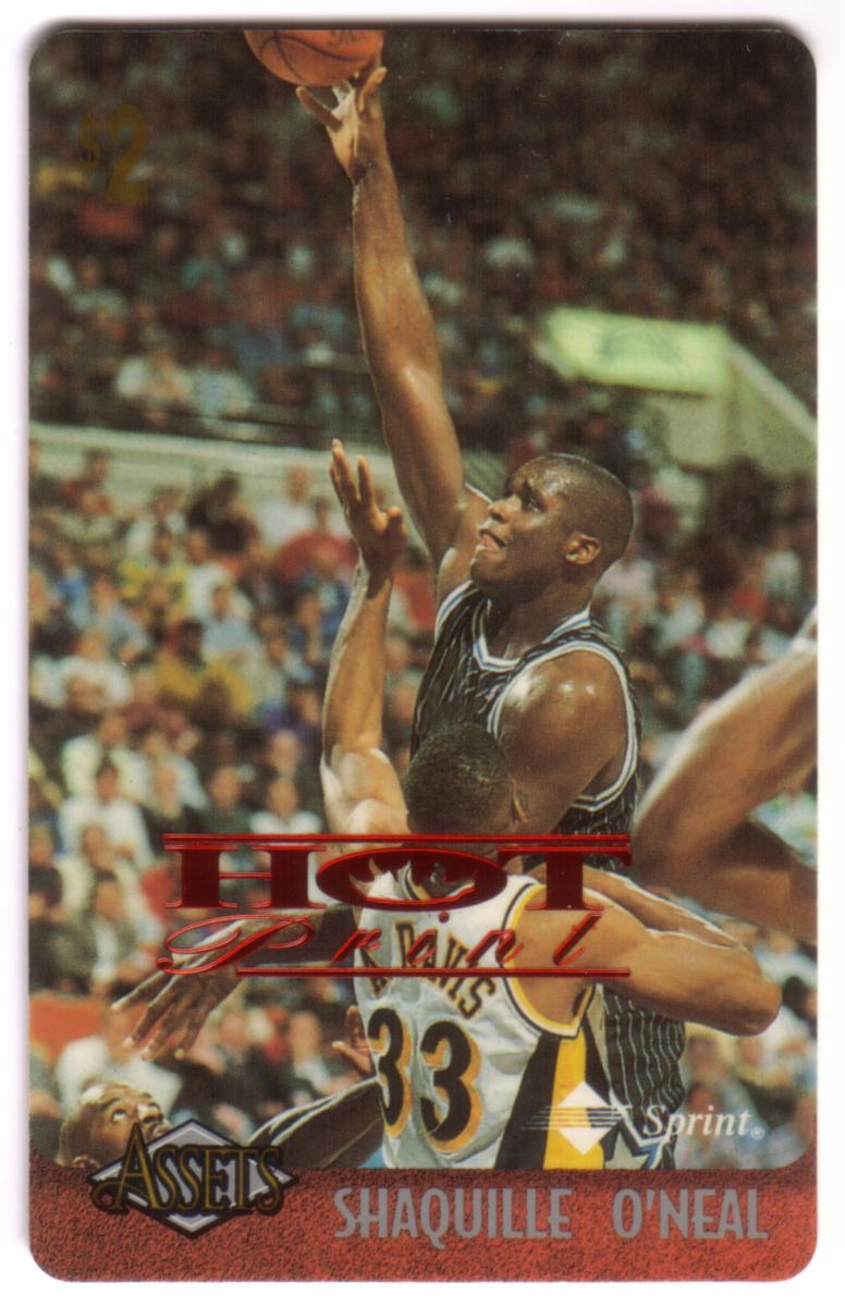 The card’s design includes the "HOT PRINT" logo prominently displayed across the lower-middle section in red capital letters with stylized gold accents. Near the bottom left corner, the "Assets" logo appears in a decorative font. On the right side, the Sprint logo is visible, indicating a sponsorship. At the bottom of the card, Shaquille O'Neal's name is printed in bold white capital letters on a solid red band.
