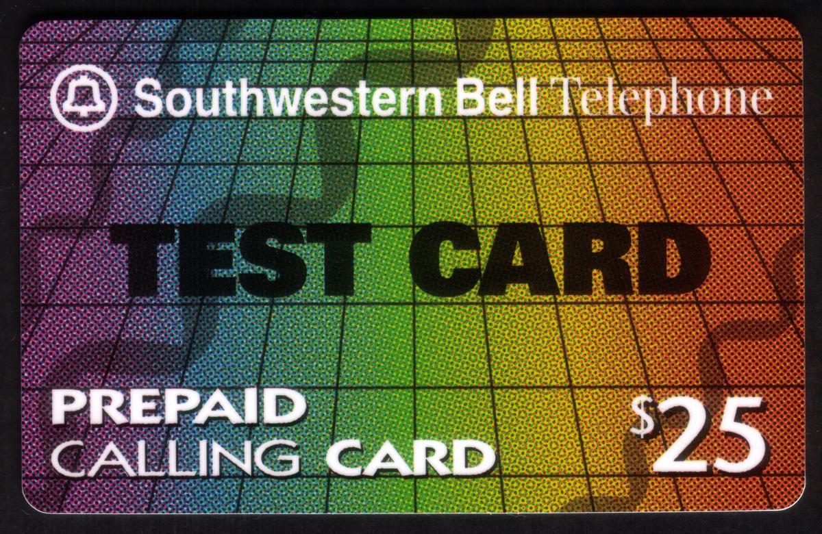 The card’s artwork includes abstract elements related to visual color testing rather than photographs or illustrations of people or places. The entire front of the card uses a vivid, graphic style that highlights the concept of color calibration and broadcast testing. This phone card is a collectible item showcasing the aesthetics of technical test patterns combined with commercial branding from Southwestern Bell.
