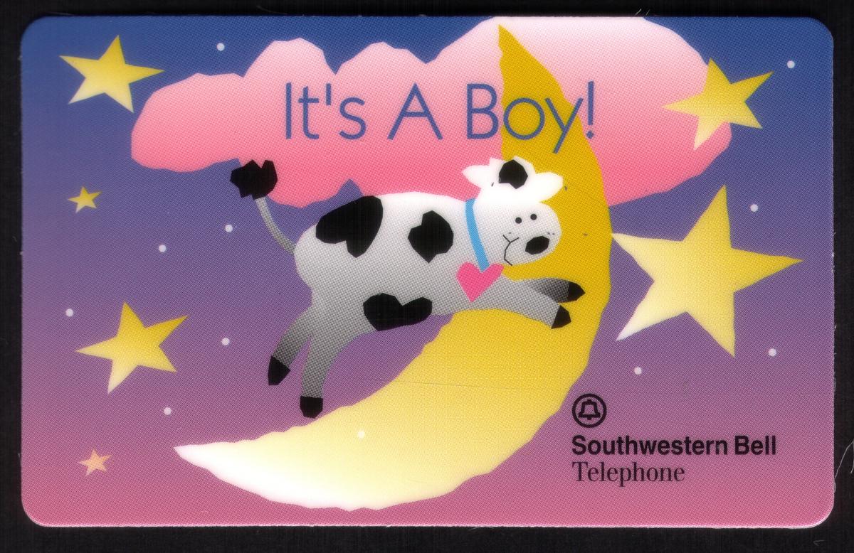 Keywords: Greetings, birth announcements, birthdays, birthday celebrations, moons, half moons, stars, cows, animals, bovines, clouds, boys, children, the cow jumped over the moon, Southwestern Bell