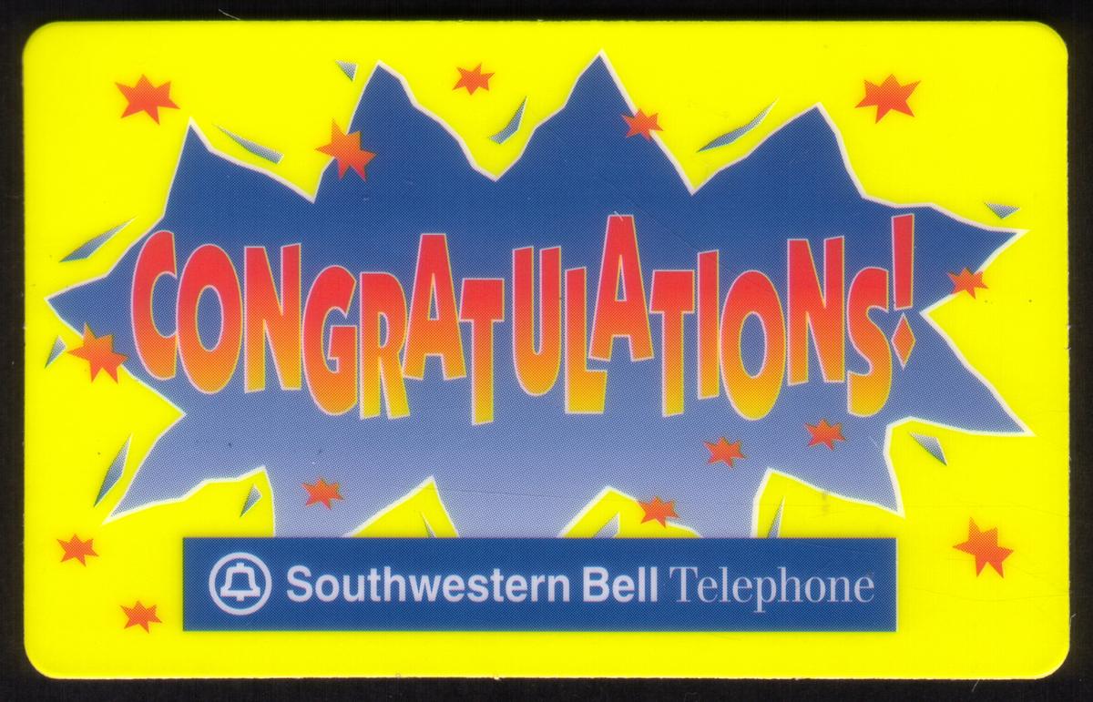 This collectible phone card features a colorful and fun design with the word “Congratulations” prominently displayed in large, playful letters across the center. The background is filled with vibrant colors, including shades of blue, green, red, and yellow, creating an energetic and celebratory atmosphere. Numerous small stars in various colors scatter throughout the design, adding to the festive appearance.