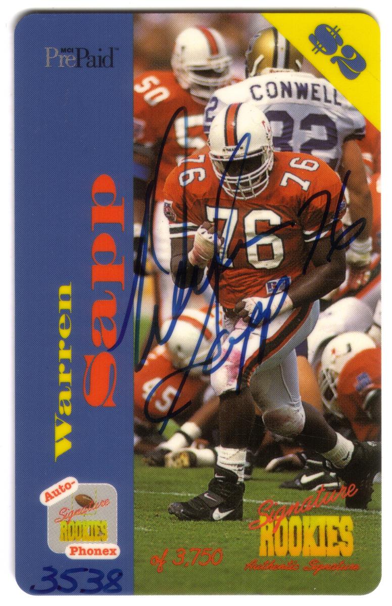 This collectible card represents a combination of sports memorabilia and telecommunications branding, focusing on rookie signatures from NFL athletes. It commemorates Warren Sapp’s rookie status and autograph within a limited series of 40 cards. The card has a collectible value linked to NFL football players and the Auto-Phonex brand, highlighting an intersection of football and phone card marketing.