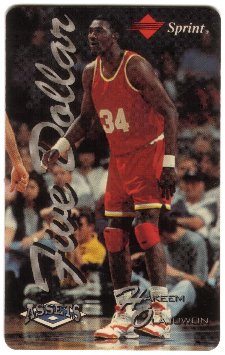 This collectible card features Hakeem Olajuwon, a prominent NBA basketball player recognized as one of the Most Valuable Players (MVPs) in basketball history. His full name, Hakeem Olajuwon, is prominently displayed on the card. The card is part of the Assets Series #1 and is associated with The Score Board Inc., a company known for sports-themed collectibles. The term "SAMPLE (NO Time)" appears on the card, indicating it is a sample version from the series.