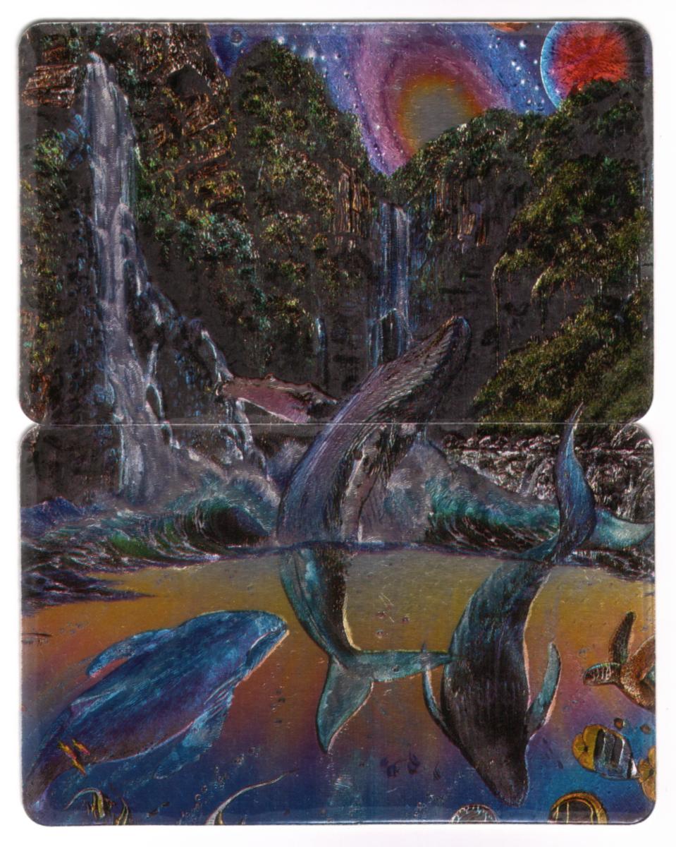 This collectible phone card features a vividly detailed aquatic fantasy scene. The artwork showcases a pod of whales and dolphins gracefully swimming through vibrant ocean waters. The marine life is set against a dynamic background of waves and an underwater environment filled with small tropical fish, coral, and bubbles. The composition highlights the majestic movement of the whales that appear partly submerged, capturing a blend of realism and artistic imagination.