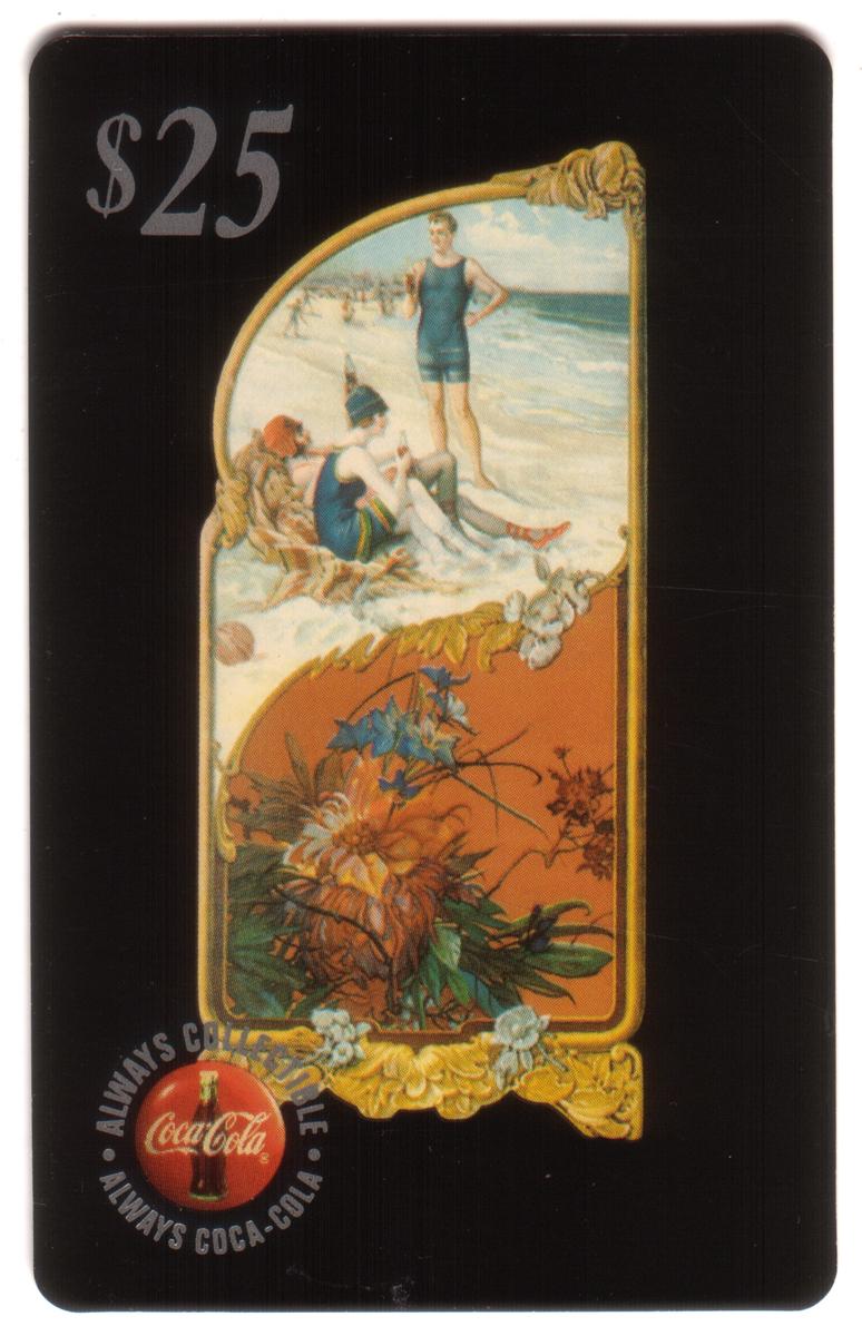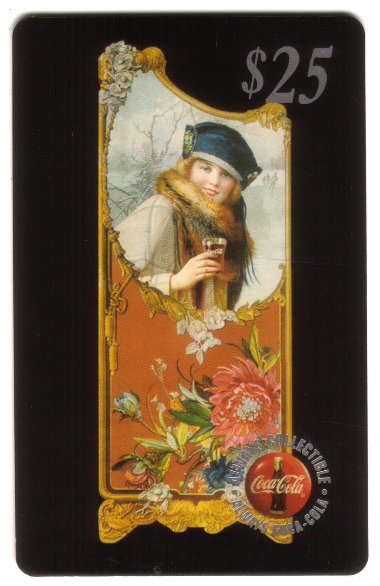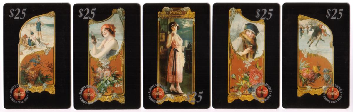 This set of five collectible Coca-Cola phone cards each has a face value of $25 and features vintage-style artwork framed by ornate golden borders with floral accents. Each card prominently displays the classic red Coca-Cola button logo with the phrase "ALWAYS COLLECTIBLE ALWAYS COCA-COLA" circularly around it near the bottom. The background of all the cards is black, creating a striking contrast with the colorful, detailed illustrations inside the gold frames.