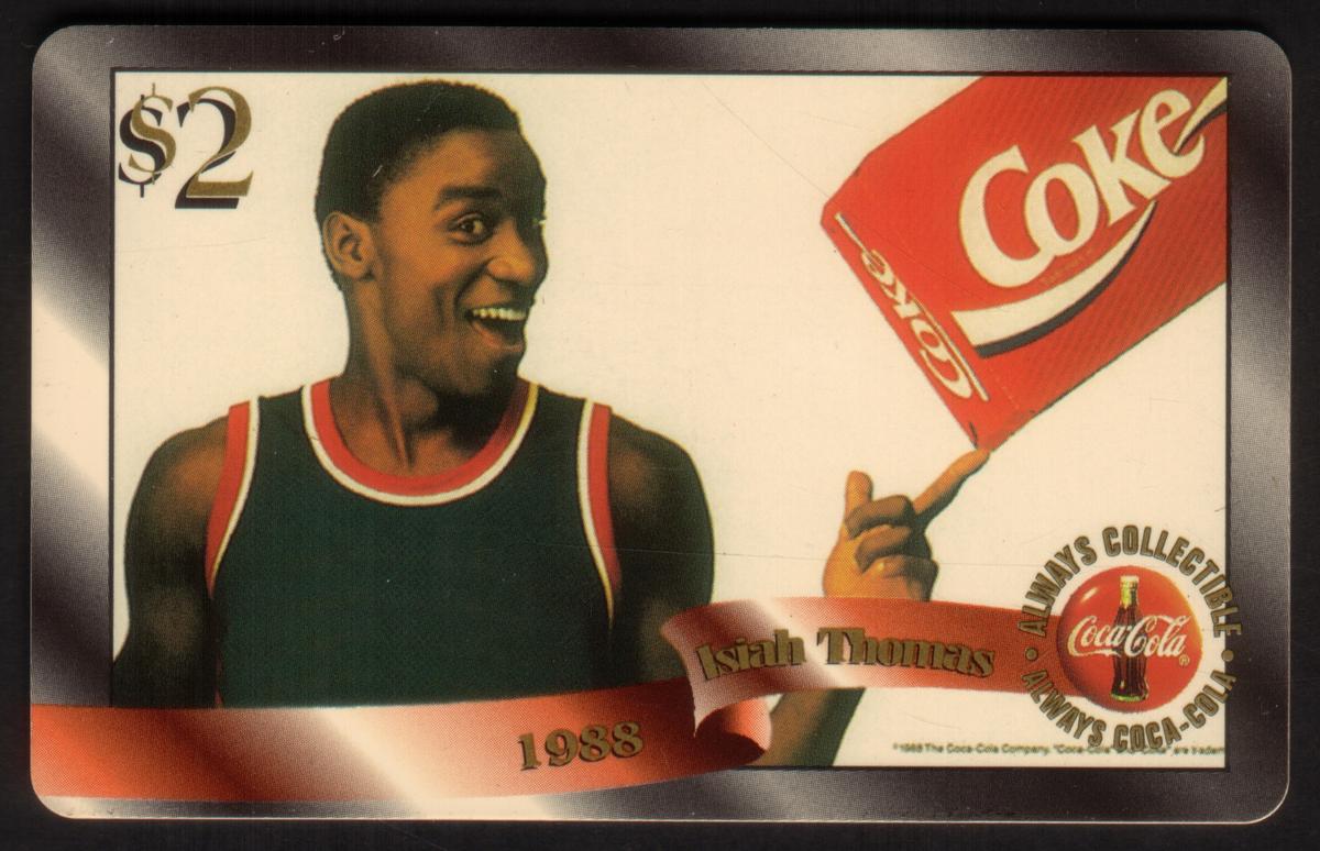 This collectible card features Isiah Thomas, a renowned basketball player, prominently displayed on the front. The card belongs to the Coca-Cola '96 series and is marked as a $2 denomination. It is the Coke Card #2 of 48 from the Gold Edition produced by The Score Board Inc. The design incorporates multiple Coca-Cola logos arranged around the edges, emphasizing the brand’s strong association with the card.