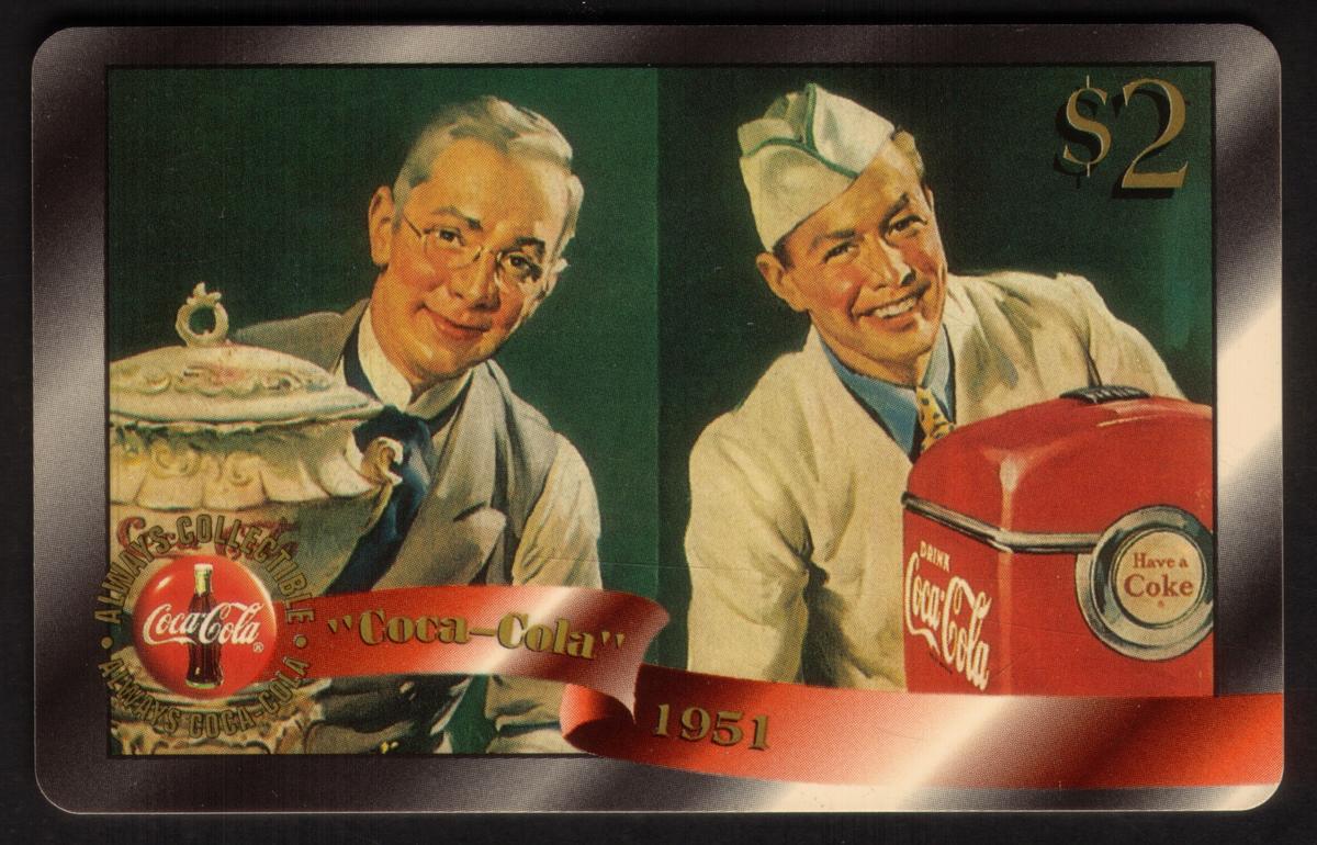 This collectible card features prominent Coca-Cola logos displayed multiple times across the design. The card highlights a vintage 1951 Coca-Cola "96 $2. Men Thru 65 Years" theme, emphasizing the lasting legacy and appeal of Coca-Cola through the decades. The design includes classic Coke logos in red and white, alongside an image of a red Coke dispenser positioned prominently. The overall aesthetic blends historical elements with the iconic branding that Coca-Cola is known for.