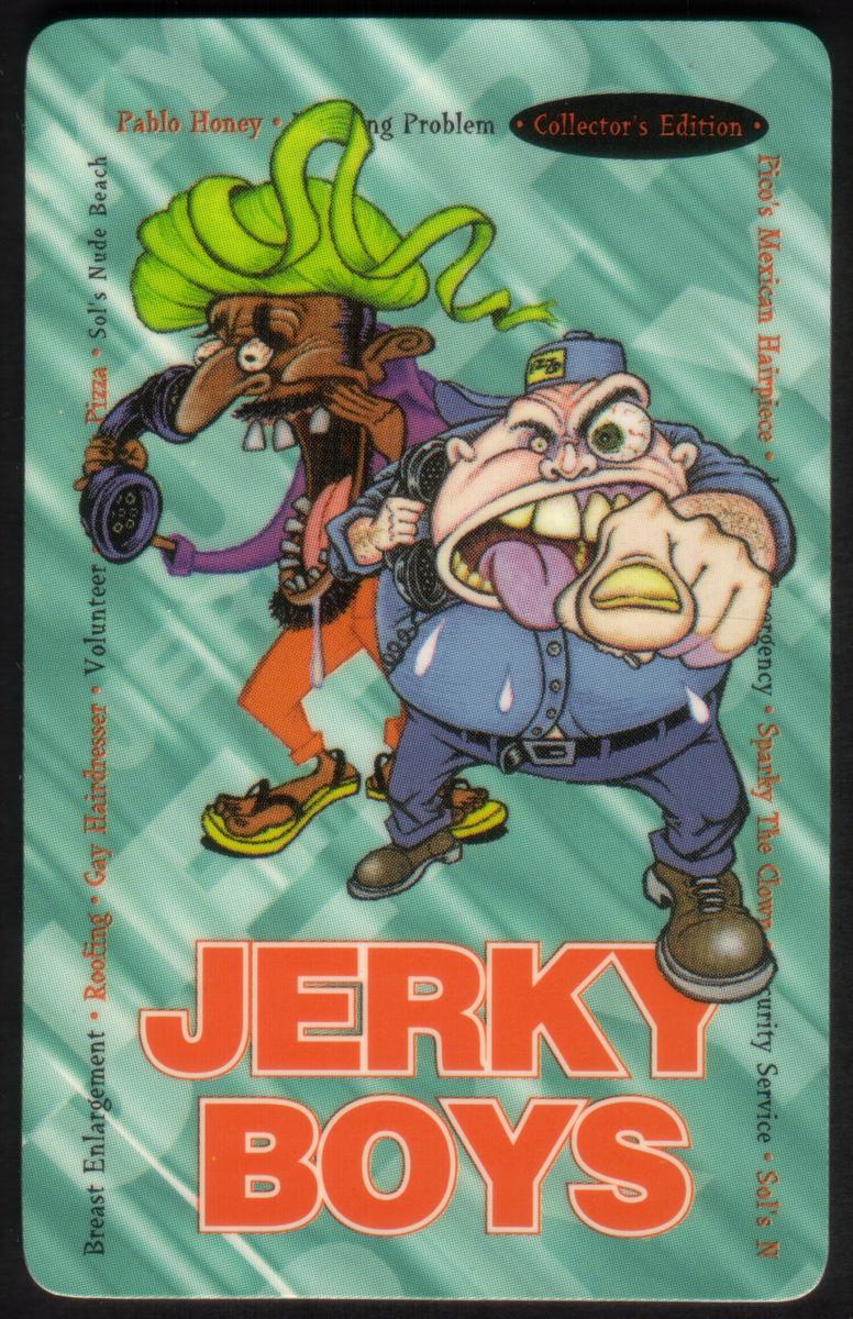 This collectible phone card features artwork from the Jerky Boys, a comedy duo known for their prank calls. The card displays cartoon-style illustrations of the Jerky Boys characters, recognizable for their exaggerated facial expressions and distinctive looks. The background is a light yellow gradient, creating a lively and playful atmosphere that matches the comedic theme of the card.