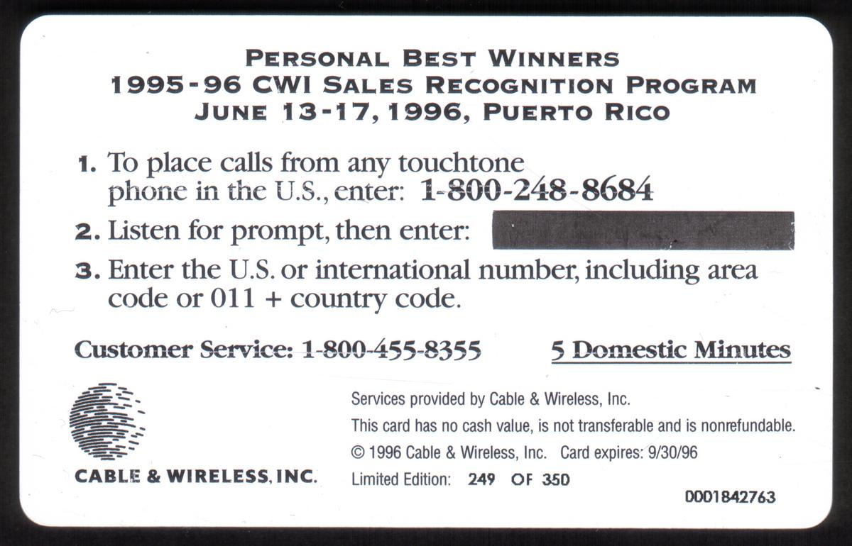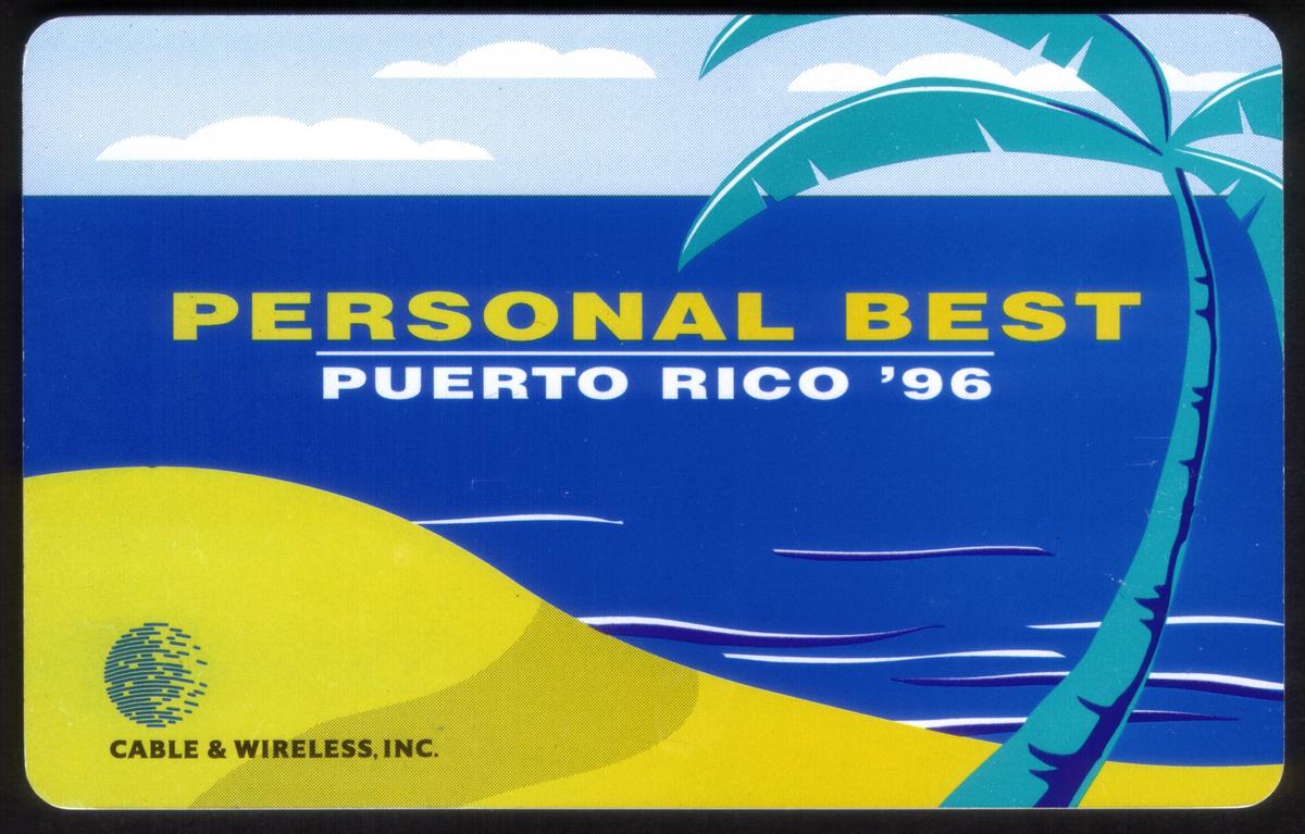 This card is part of a promotional series related to sightseeing and travel in Puerto Rico and its surrounding American territories. It is associated with the Cable & Wireless (CWI) "Personal Best" sales recognition program dated June 1996.