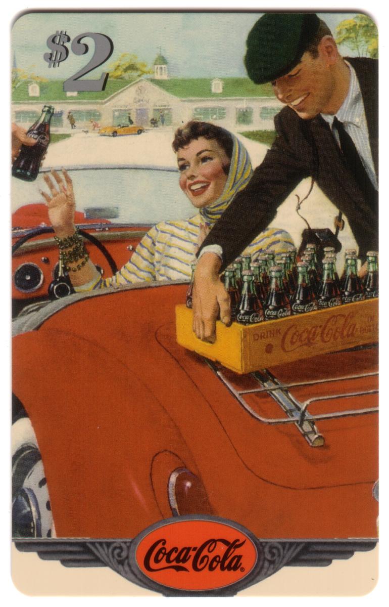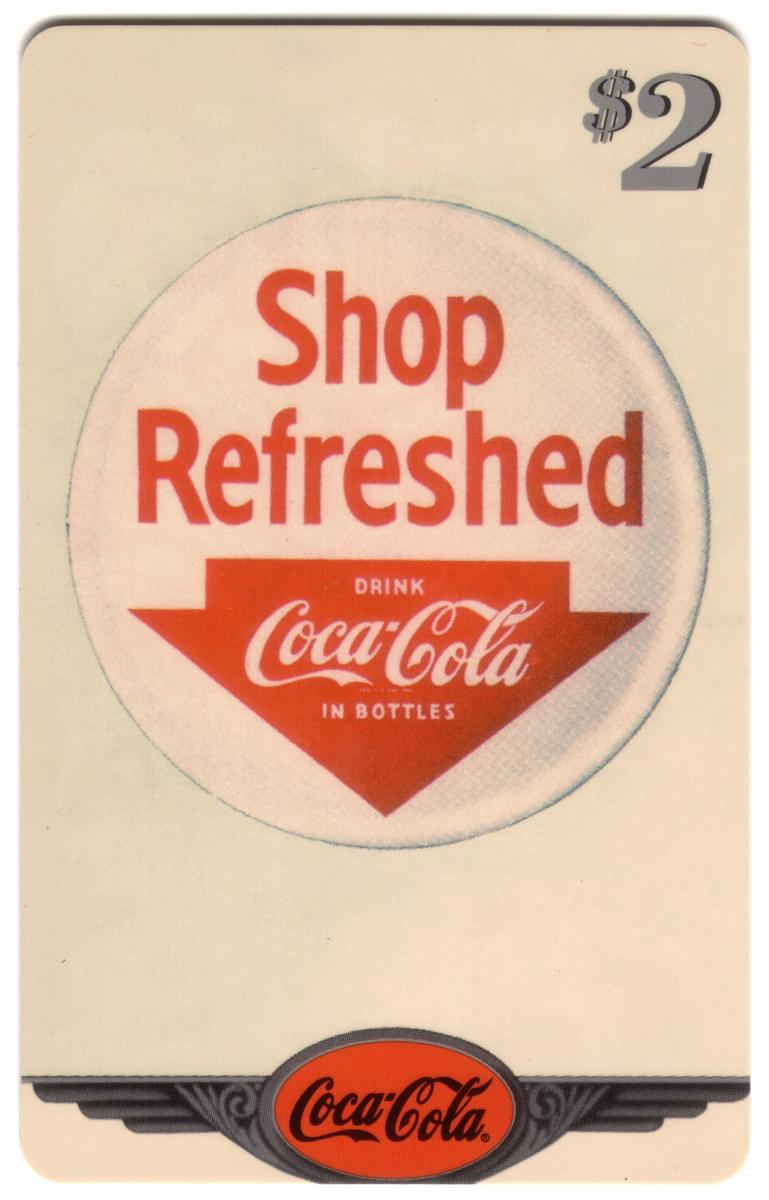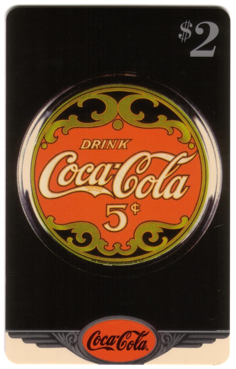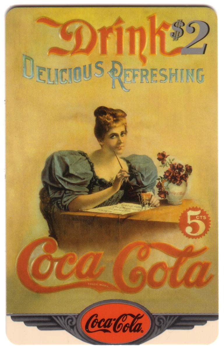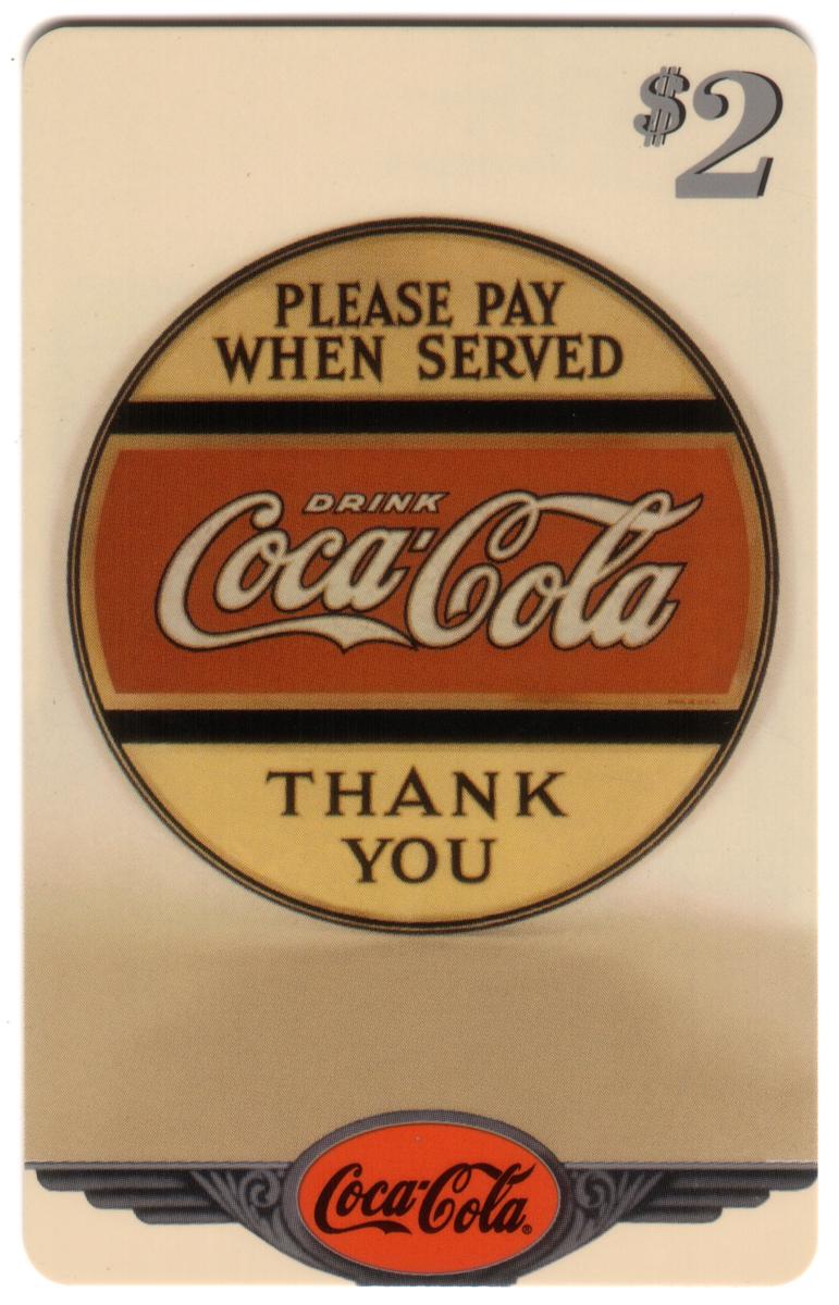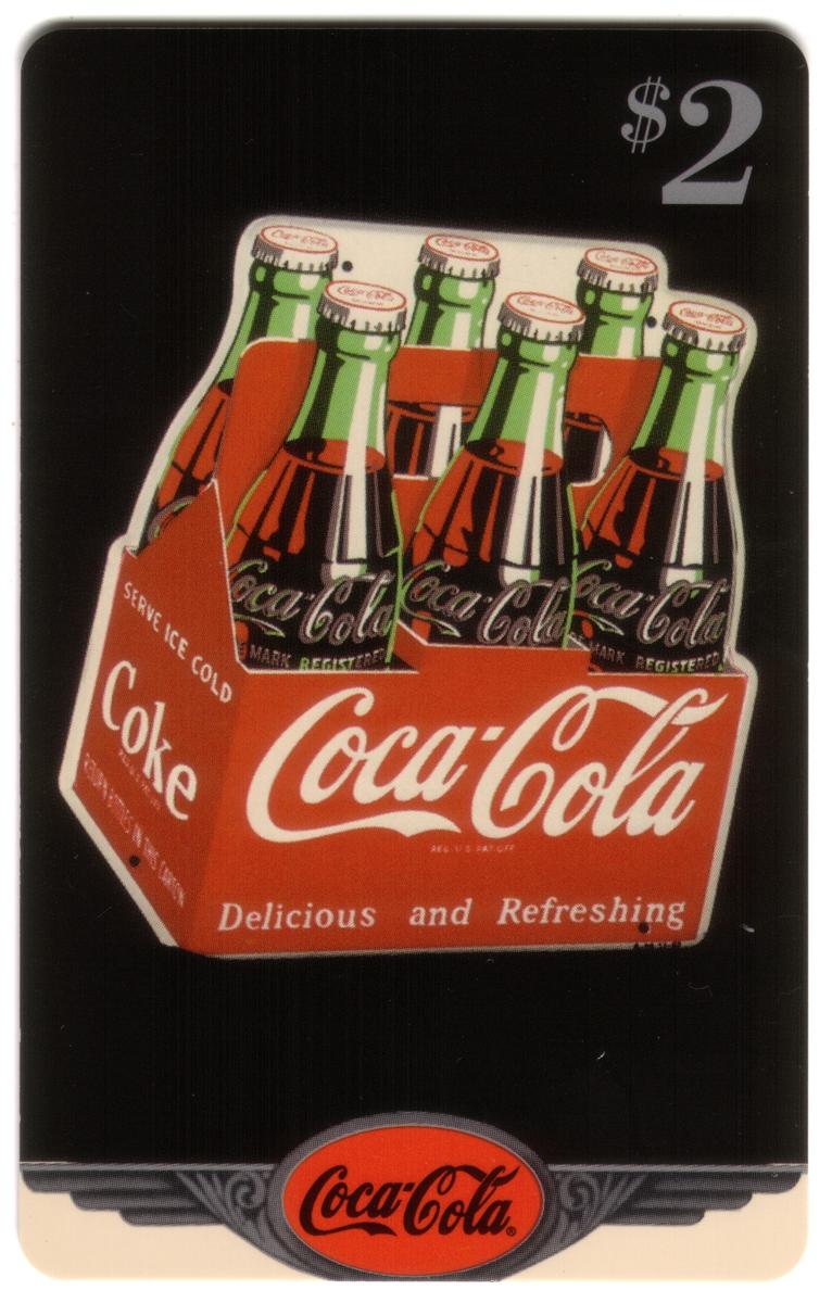 Each card uses classic Coca-Cola branding, pairing vintage advertising artwork with slogans and product imagery designed to evoke Coca-Cola’s long-standing cultural and historical appeal. The presence of the $2 denomination is consistent across all cards, and the Coca-Cola logo is prominently displayed in red at the base of each card, set against a decorative silver-gray frame. This set provides a comprehensive visual journey through Coca-Cola's iconic advertising history, capturing both product and lifestyle elements associated with the brand.