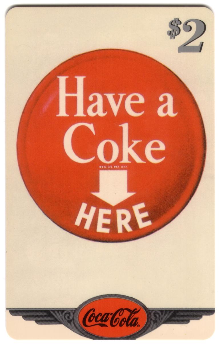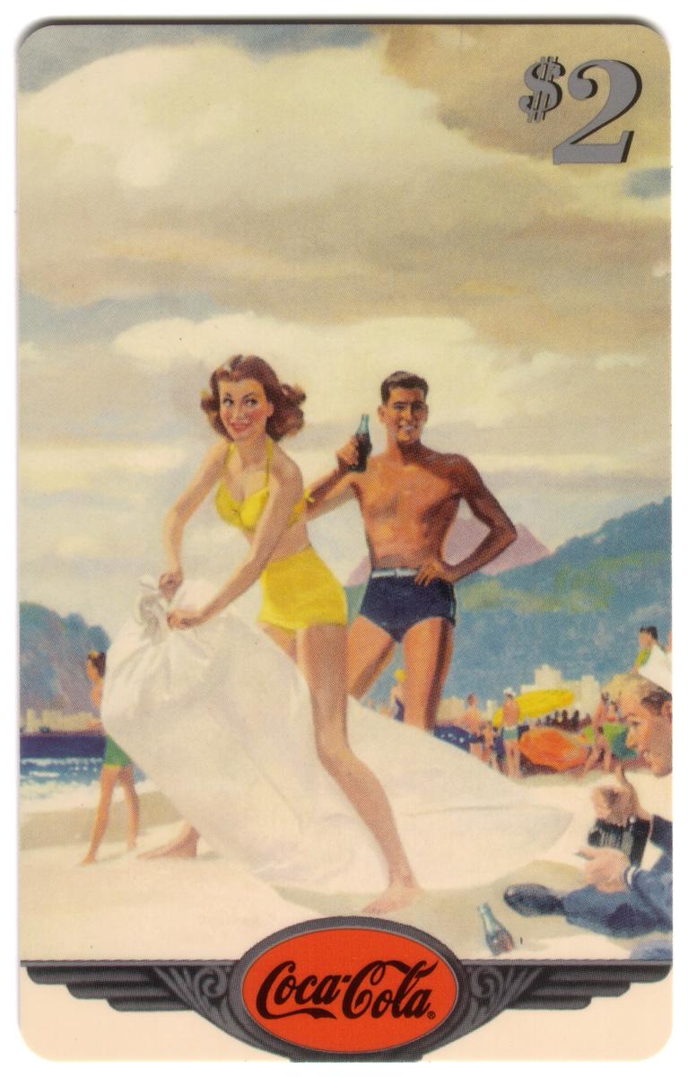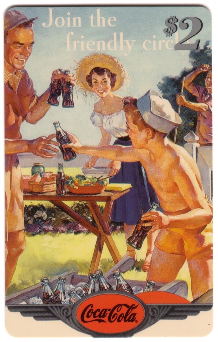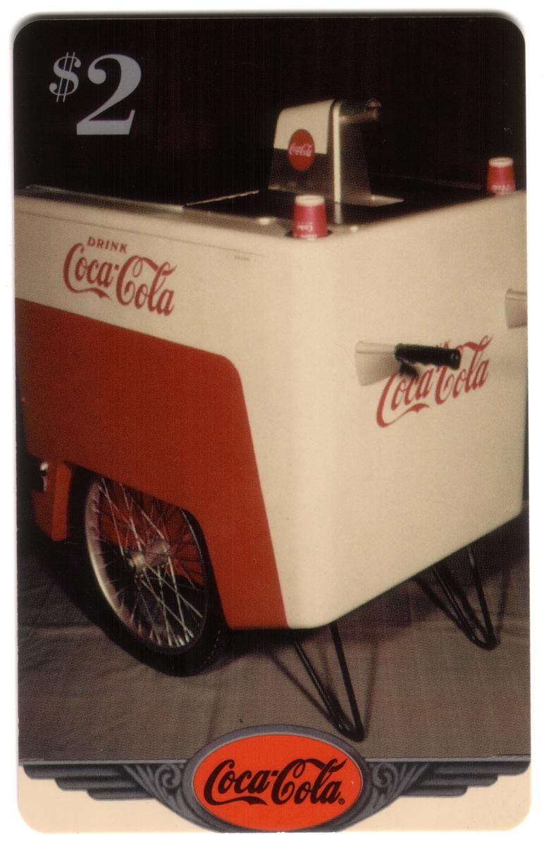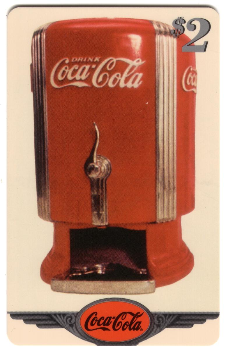 Each card uses classic Coca-Cola branding, pairing vintage advertising artwork with slogans and product imagery designed to evoke Coca-Cola’s long-standing cultural and historical appeal. The presence of the $2 denomination is consistent across all cards, and the Coca-Cola logo is prominently displayed in red at the base of each card, set against a decorative silver-gray frame. This set provides a comprehensive visual journey through Coca-Cola's iconic advertising history, capturing both product and lifestyle elements associated with the brand.