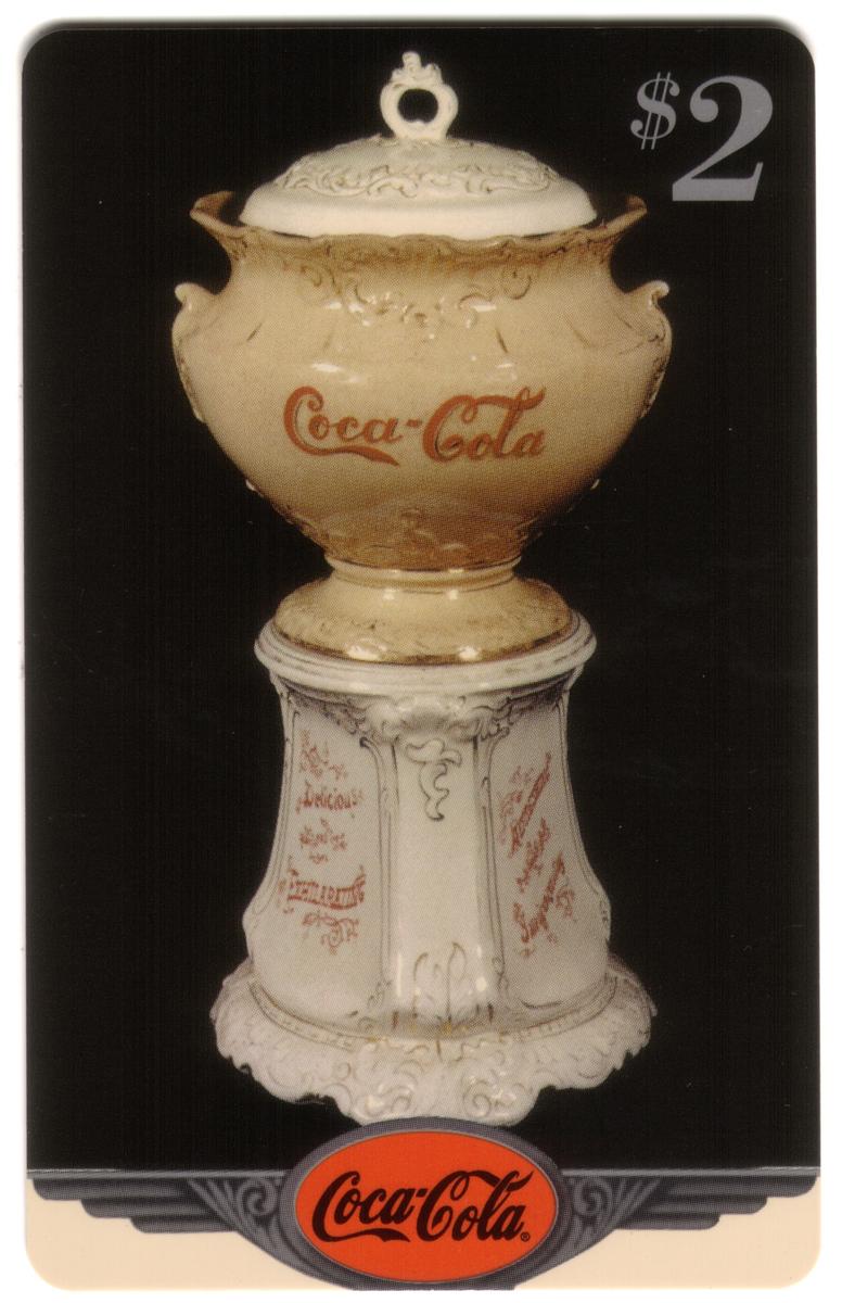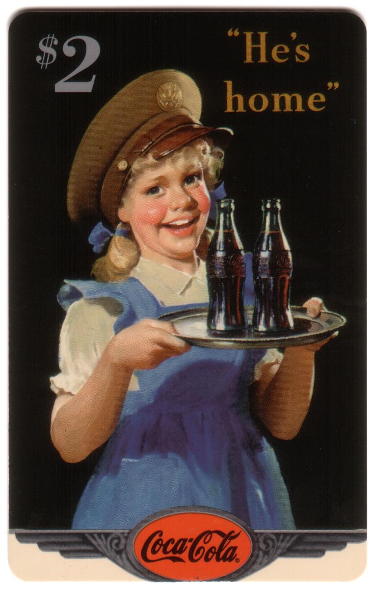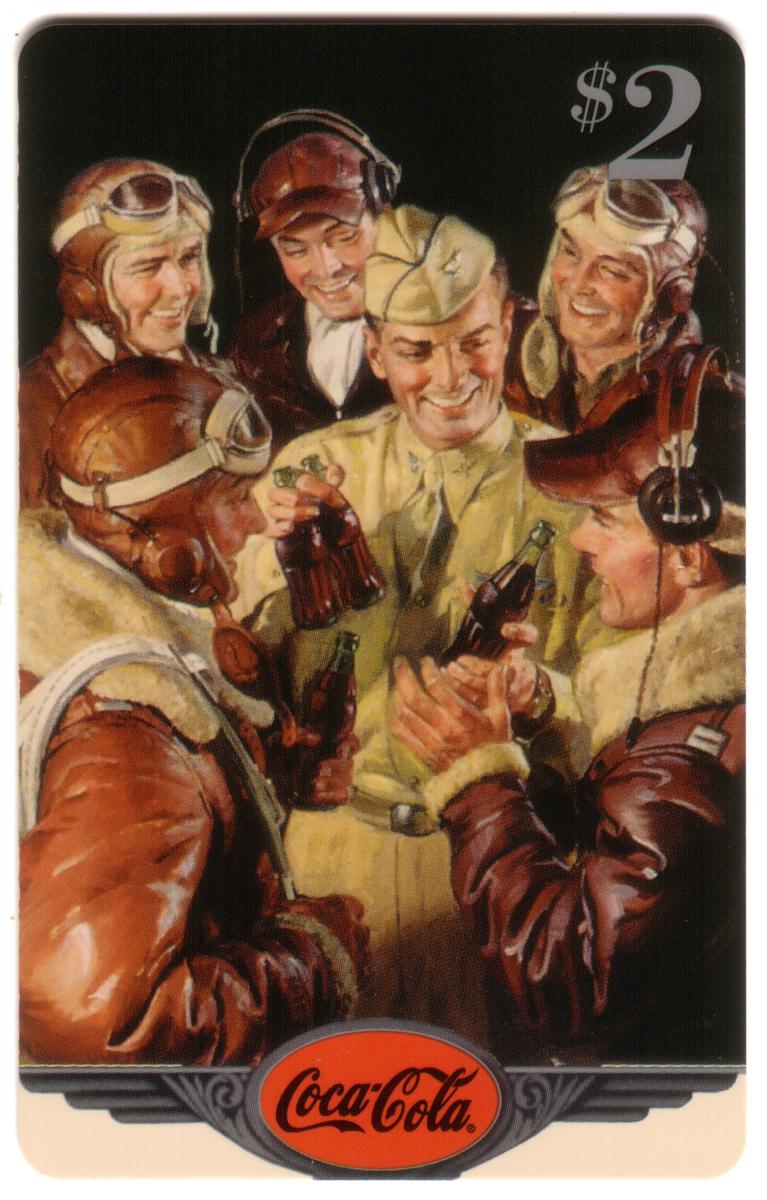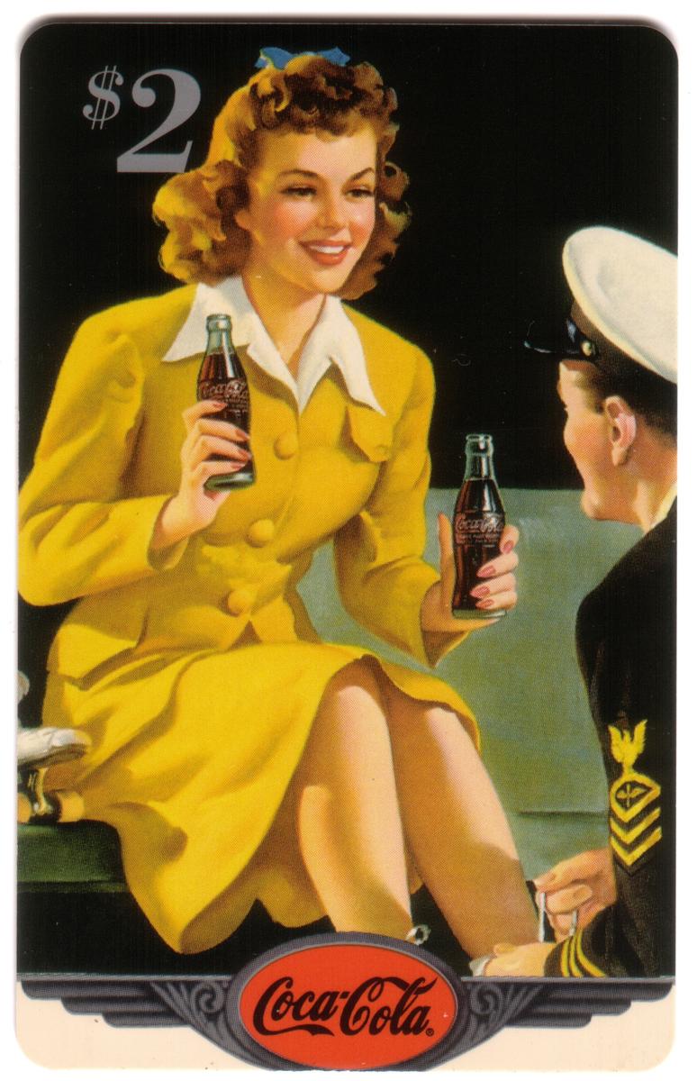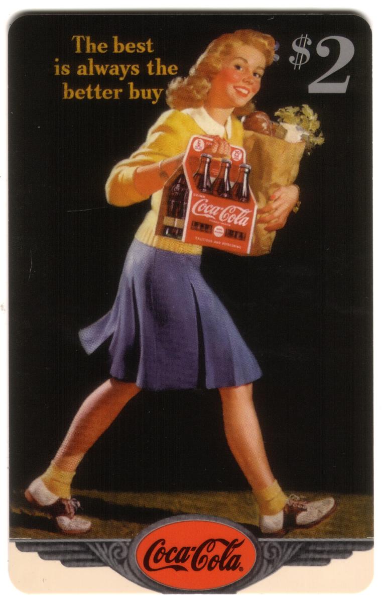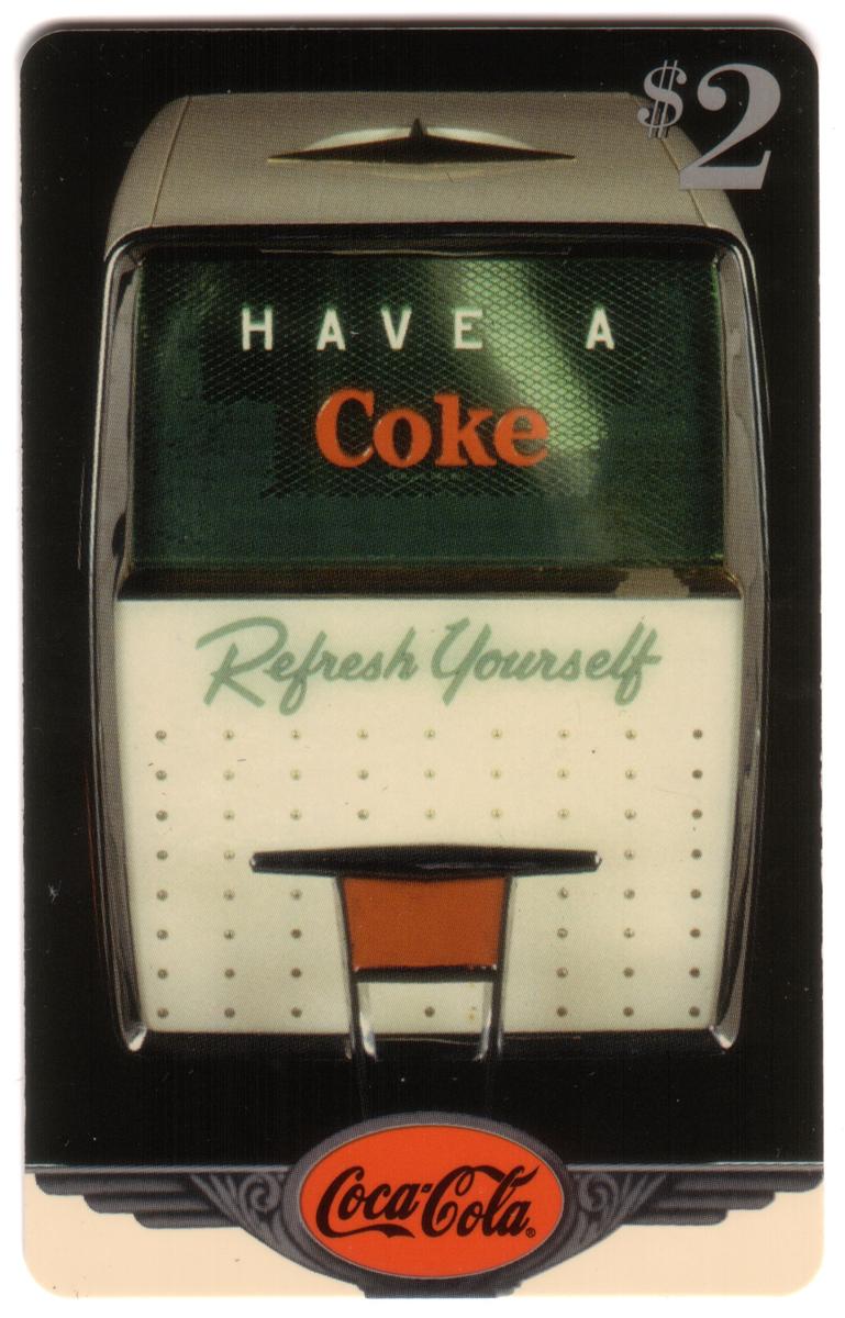Each card uses classic Coca-Cola branding, pairing vintage advertising artwork with slogans and product imagery designed to evoke Coca-Cola’s long-standing cultural and historical appeal. The presence of the $2 denomination is consistent across all cards, and the Coca-Cola logo is prominently displayed in red at the base of each card, set against a decorative silver-gray frame. This set provides a comprehensive visual journey through Coca-Cola's iconic advertising history, capturing both product and lifestyle elements associated with the brand.