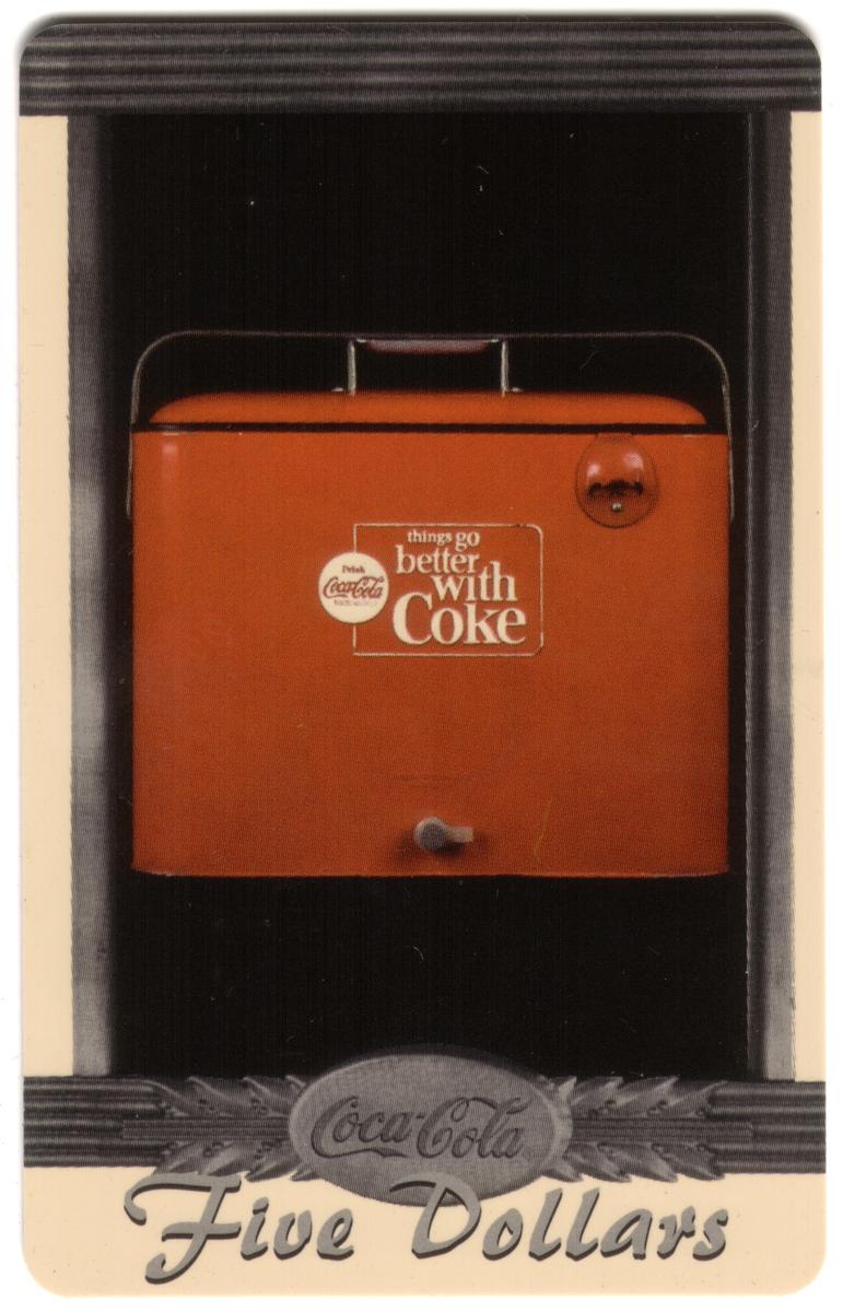 This collectible phone card features prominent Coca-Cola logos in red and white prominently displayed across the design. The card is linked to Coke National '96 and marked with a $5 value, indicating its use or collectible denomination. The design includes imagery related to vintage Coke dispensers, specifically highlighting an old Coke dispenser model, referenced as Coke #3 of 10.