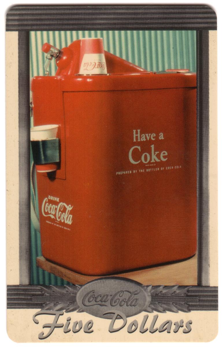 The overall composition combines brand logos with key descriptive text to create a visually distinctive collectible. The card’s use of silver and Coca-Cola motifs makes it a notable item for collectors interested in beverage branding and vintage Coca-Cola dispensers from the mid-1990s.