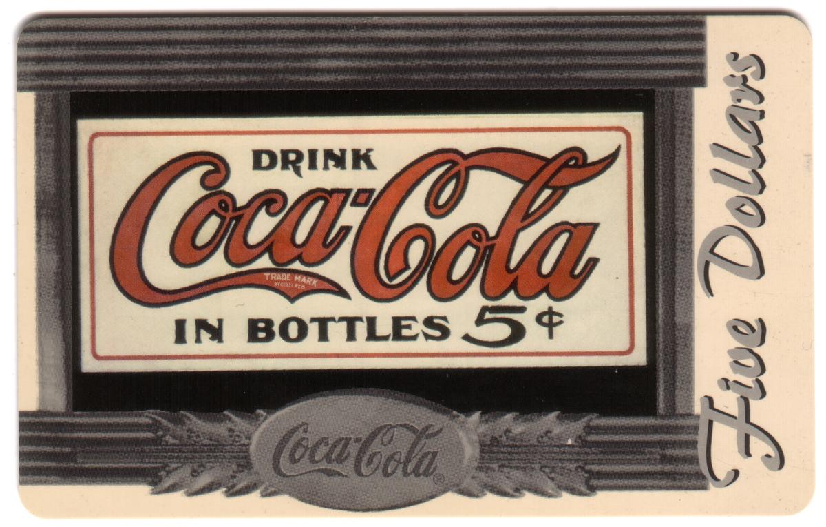 This collectible card features a detailed Coca-Cola design prominently displaying multiple Coca-Cola logos and Coke logos in classic red and white colors. The text "Coke National '96" appears clearly, indicating its connection to the 1996 Coke National series. The card’s denomination is $5 and is made of silver, highlighting its collectible and possibly commemorative nature. The phrase "Drink Coca-Cola in Bottles" in bold lettering is present, emphasizing the iconic Coca-Cola slogan.