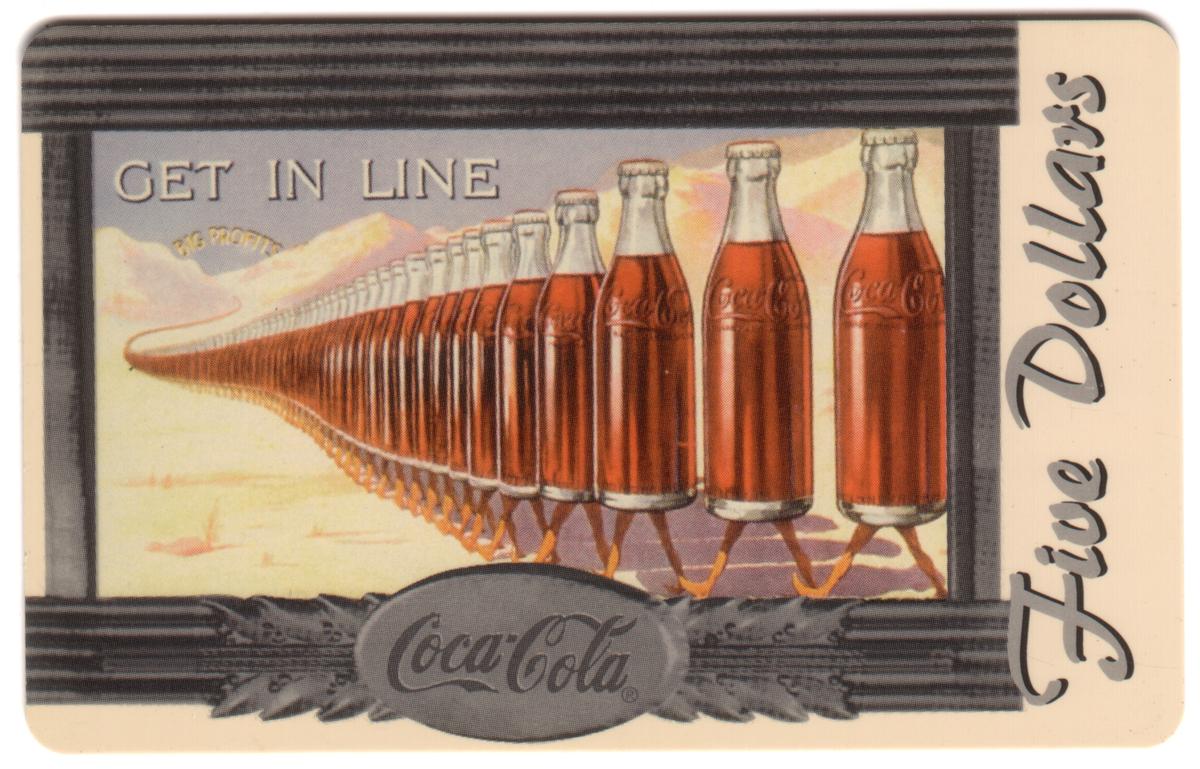 The collectible card features a rich silver background dominated by multiple Coca-Cola logos placed along the top and lower portion. The center of the card displays two classic glass Coke bottles with red caps, both featuring the signature Coca-Cola script logo on their labels. Between the two bottles, there is a bold black ampersand symbol "&" emphasizing the pairing of the bottles. Below the bottles, the phrase "Get In Line" is prominently written in a sleek, modern font.