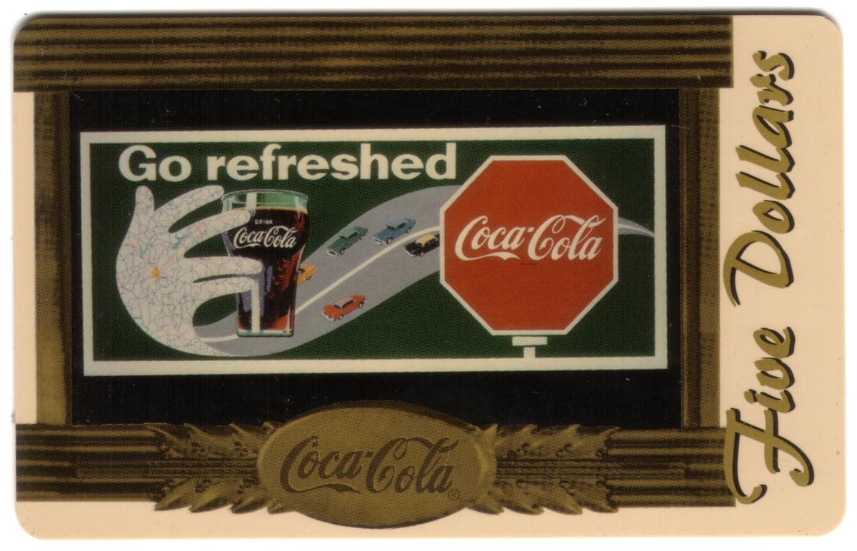 This collectible chip card features a vibrant design focused on Coca-Cola branding. Multiple Coca-Cola logos and Coke logos are prominently displayed, emphasizing the iconic red and white color scheme associated with the brand. The card includes the text "Coke National '96 $5. GOLD," indicating its value and possibly its association with a 1996 event or series related to Coca-Cola. The phrase "Go Refreshed" and a stop sign graphic are visible, adding to the dynamic visual impact of the card.