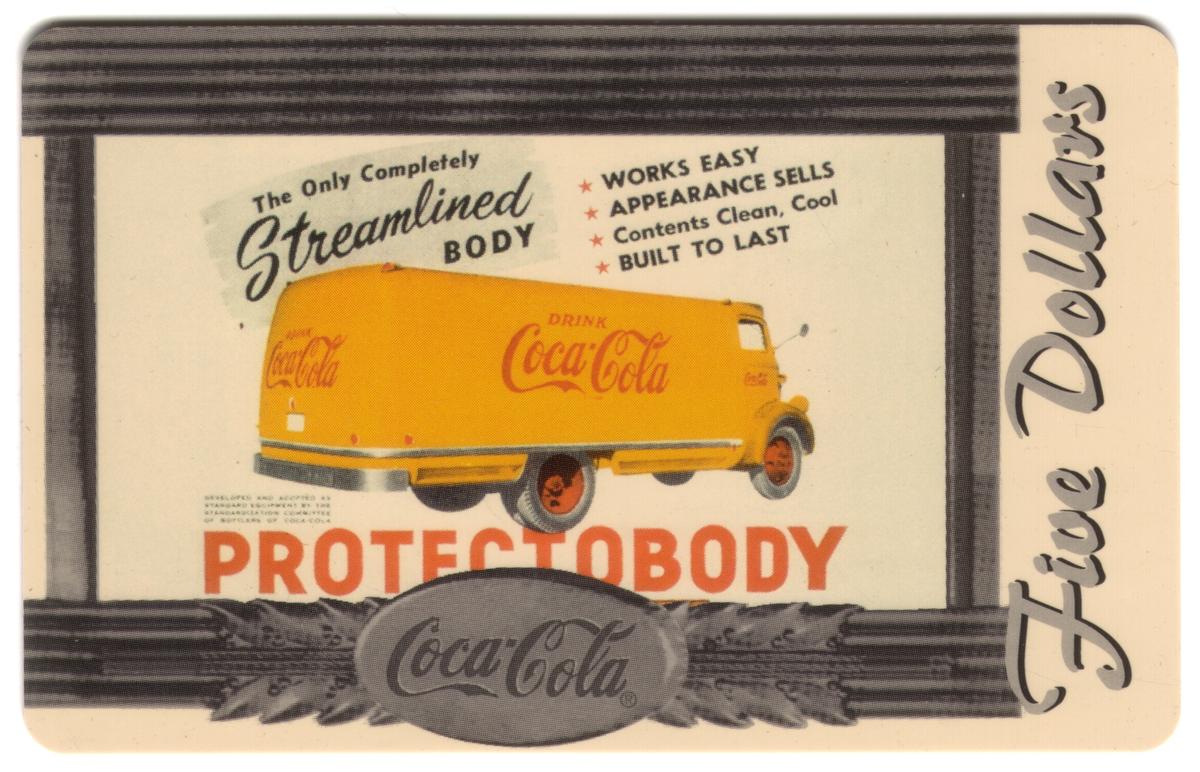 This collectible card features a vintage Coca-Cola delivery truck prominently displayed in yellow with red Coca-Cola logos on its side. The truck has a streamlined body design, highlighted by the phrase "The Only Completely Streamlined Body" printed near the top. Additional text around the truck emphasizes its qualities: "Works Easy," "Appearance Sells," "Contents Clean, Cool," and "Built to Last." The phrase "PROTECTOBODY" is printed in large red letters below the truck image.