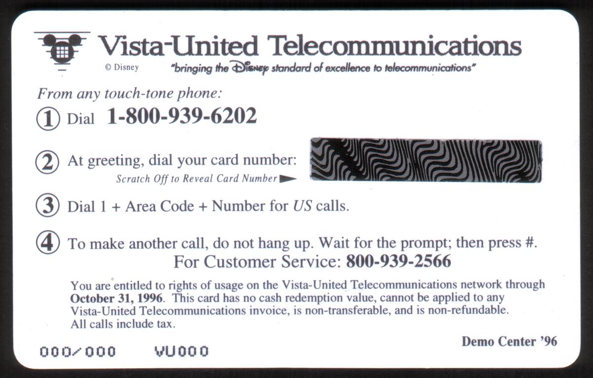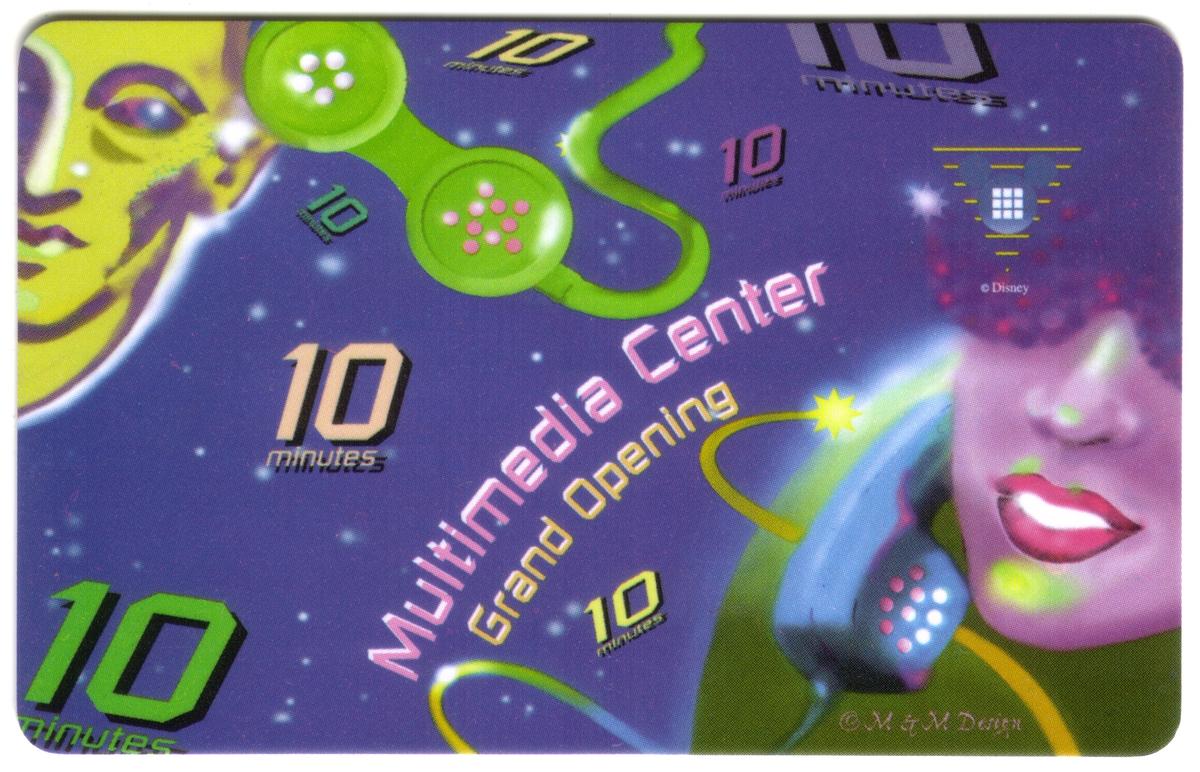 This card is issued by Vista-United and is explicitly associated with Walt Disney World and Disney’s theme park attractions. It is a 10-unit phone card intended for telephone use, and it marks a special event: the grand opening of a multi-media center. The design blends animation and technological motifs, fitting Walt Disney’s reputation for creativity and multimedia innovation.