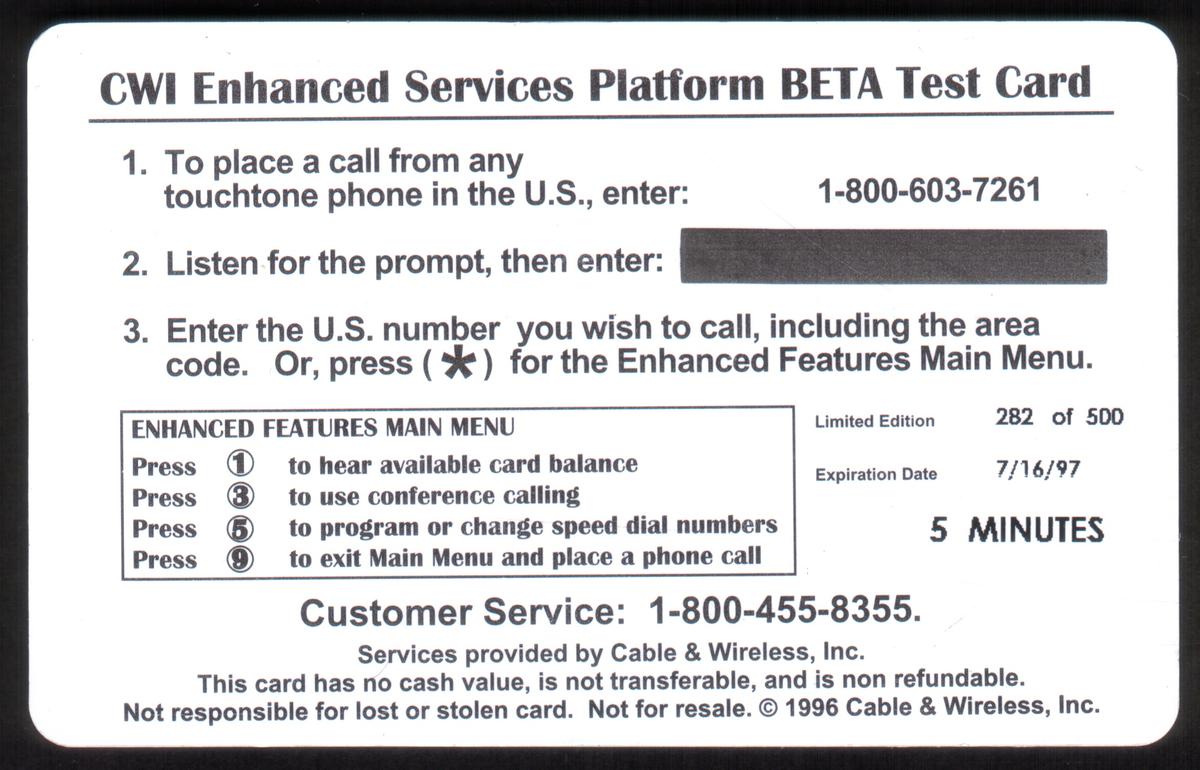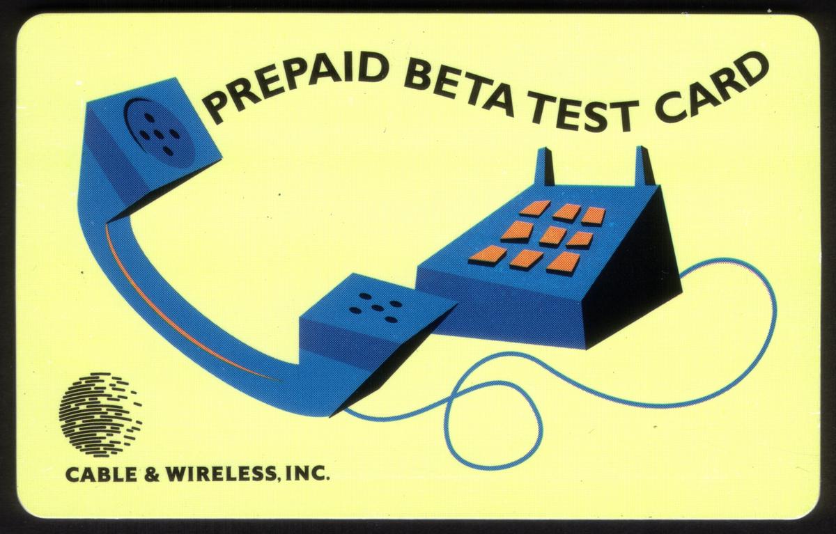 This card is associated with Cable & Wireless and labeled as a prepaid beta test card, relating to the Cable & Wireless Enhanced Services Platform. It represents a promotional collectible linked to telephones, prepaid phone services, and beta testing of telecommunications technology.