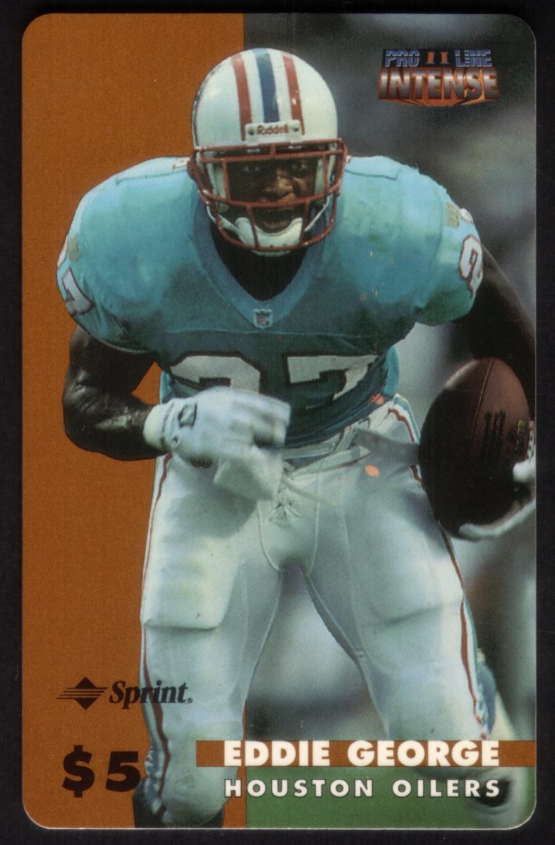 The styling of the card includes a sharp, crisp photograph of Eddie George in action or posed in a football stance. The graphics have a modern 1990s design aesthetic, with the use of intense colors and dynamic text placement, aligning with the "Proline Intense" branding. All text and imagery are clear, with no additional logos or text beyond essential information about the player, team, and series.