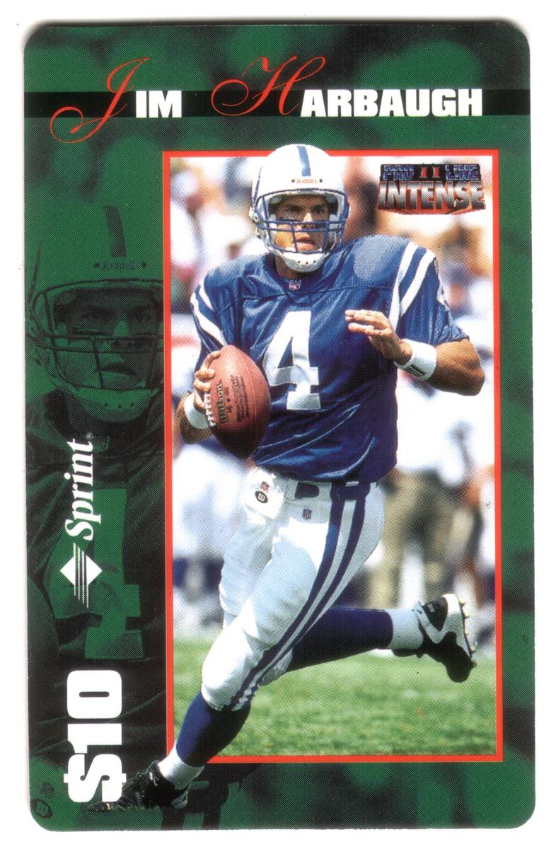 This collectible phone card features Jim Harbaugh, a former NFL football player, in action wearing his Indianapolis Colts uniform. Harbaugh is pictured mid-play, holding a football in his right hand while preparing to make a pass. He is dressed in a blue jersey with the number 4 displayed prominently on the front, along with white pants and a white helmet marked with the Colts’ horseshoe logo. The photograph captures Harbaugh on a grassy football field with blurred spectators in the background.