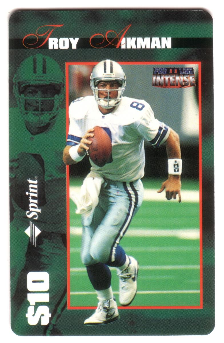 The card has several textual elements including "TROY AIKMAN" written at the top in a combination of black and red fonts. The $10 value is prominently printed vertically on the left side along with the Sprint logo in white. In the upper right corner, there is a Proline Intense logo displaying the brand and series name. The card’s overall design emphasizes Troy Aikman as a notable player in the National Football League (NFL).