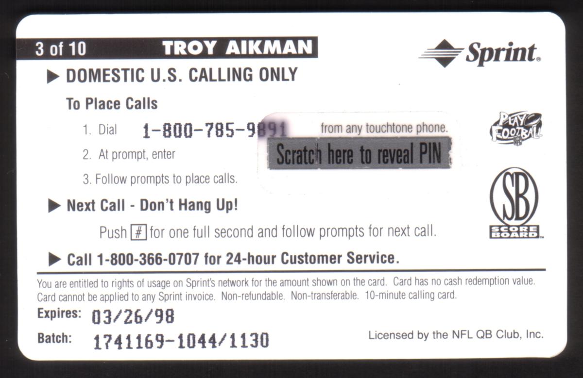 This card is issued by The Score Board Inc. and represents a collectible sports phone card celebrating football and NFL star Troy Aikman. The $10 denomination and the NFL football theme make it a desirable item for collectors of sports memorabilia, especially those focusing on the late 1990s era of football.