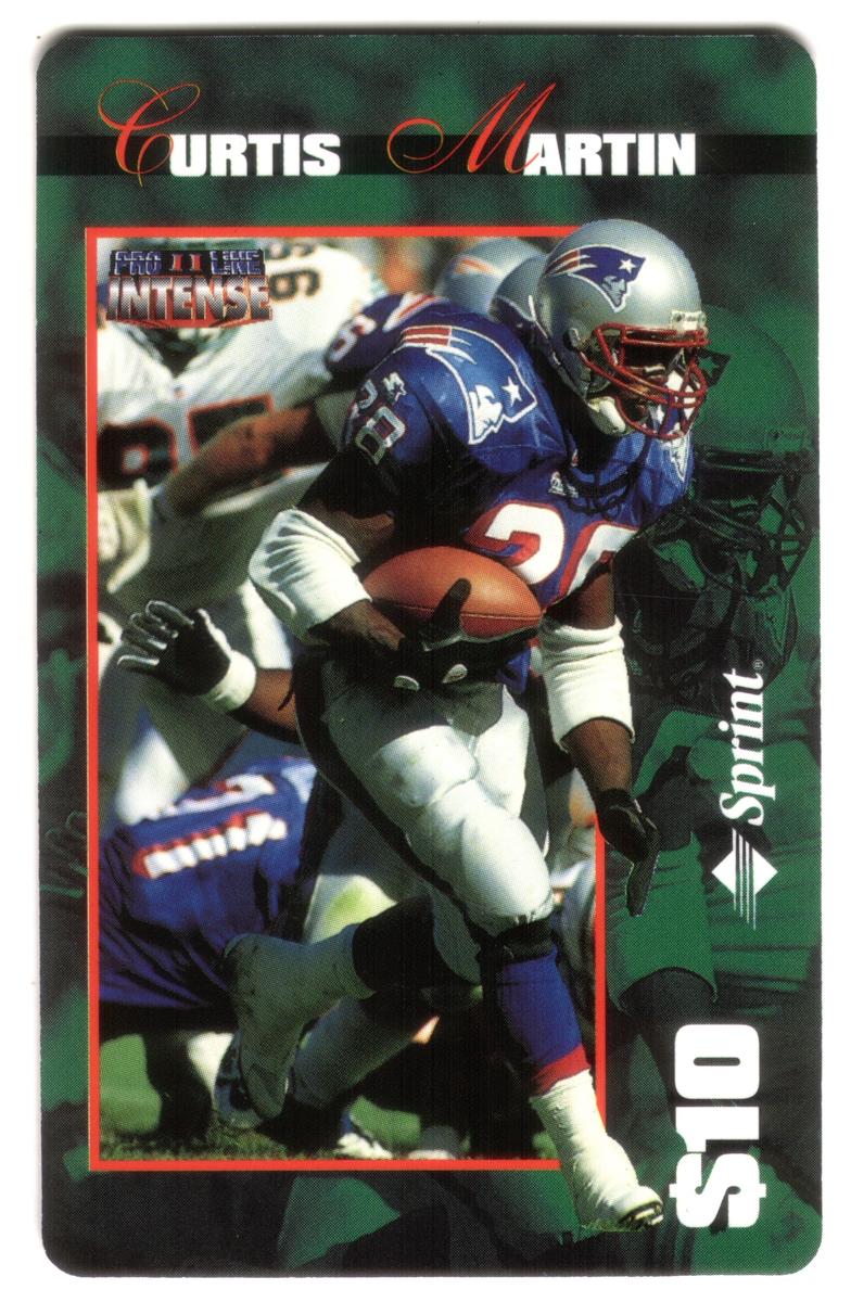 This collectible card features Curtis Martin, a professional football player for the New England Patriots in the National Football League (NFL). The image captures Martin in action on the field, wearing his full Patriots uniform including a silver helmet with the Patriots logo, a blue jersey with the number 28, and white pants. He is holding a football tightly in his right hand, running forward with determination as opposing players attempt to tackle him.