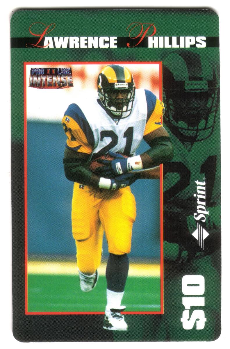 This collectible phone card features Lawrence Phillips, a professional football player wearing the uniform of the St. Louis Rams NFL team. He is pictured running on a football field, holding a football tightly with both hands, dressed in yellow pants, a white jersey with blue and yellow sleeves, and a blue helmet with yellow horns. The helmet does not display a number. The card shows Phillips' name prominently at the top in a combination of white and red script font, "LAWRENCE PHILLIPS".