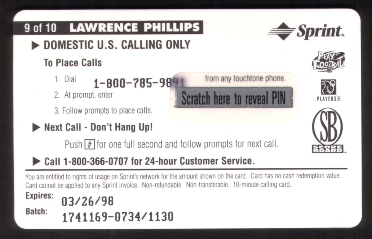 This phone card was produced by The Score Board Inc. as part of a National Football League collectible offering focused on football players, specifically from the 1997 Proline Intense lineup. It combines sports memorabilia with telecommunication value through its $10 usage allowed on the card.