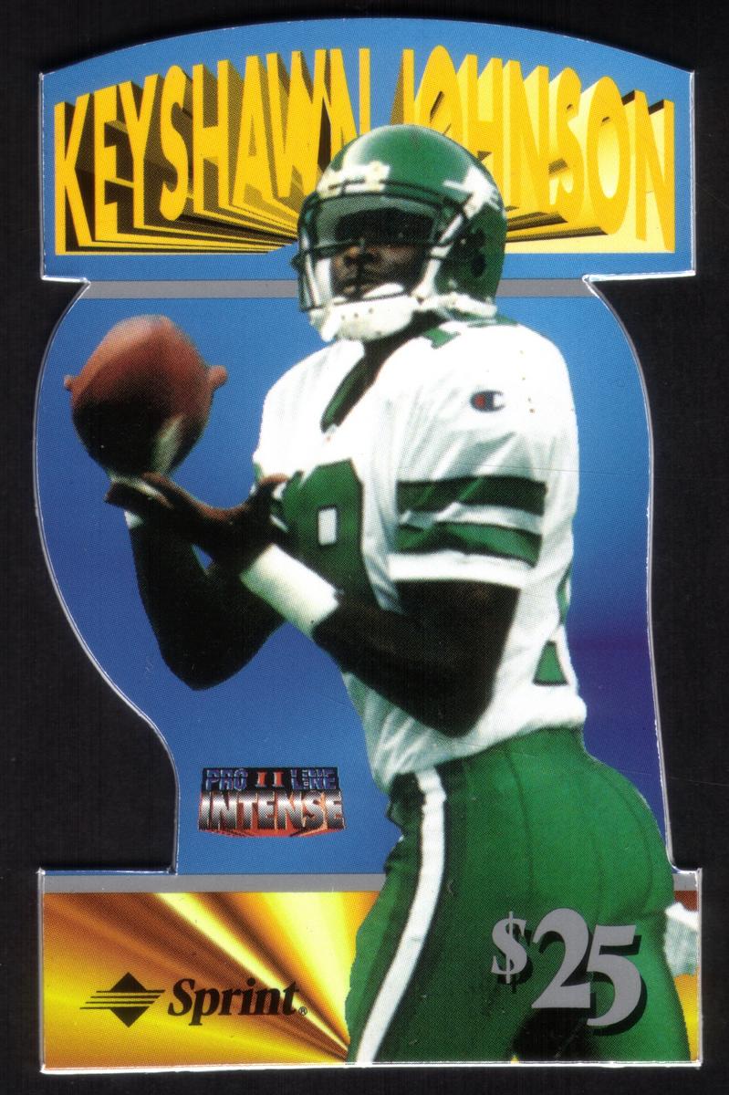 This collectible phone card features a die-cut shape highlighting Keyshawn Johnson, a professional football player, wearing a green and white uniform with a helmet. Keyshawn Johnson is pictured in the action of preparing to throw a football. The card prominently displays his name in bold, yellow block letters at the top against a blue background.