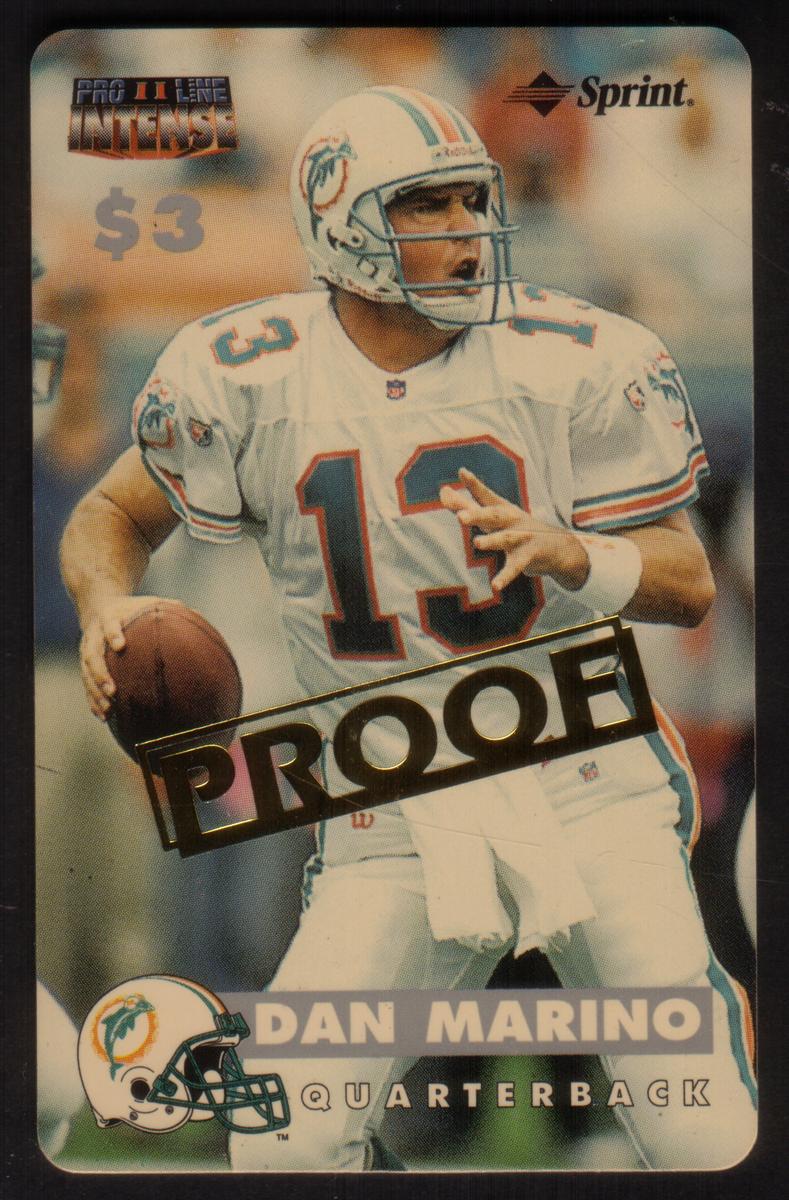 This collectible card features Dan Marino, the renowned quarterback for the Miami Dolphins in the National Football League (NFL). The card is from the Proline Intense 1997 series produced by The Score Board Inc. It is labeled as a proof card and is numbered 11 out of a limited edition of 50. The card prominently displays Marino in his Miami Dolphins uniform, wearing the team’s distinctive aqua and orange colors.