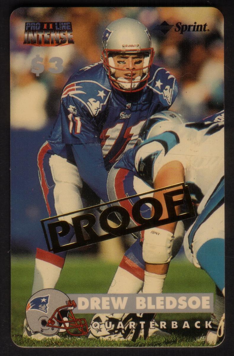 The card is produced by The Score Board Inc., a company known for creating sports collectible cards. The image and design emphasize the athlete prominently, with “Proline Intense 1997 Drew Bledsoe” clearly visible near the bottom along with a “$3” value indicator. The colors on the card are vibrant, predominantly featuring red, white, and blue, corresponding with Bledsoe’s team colors at the time.
