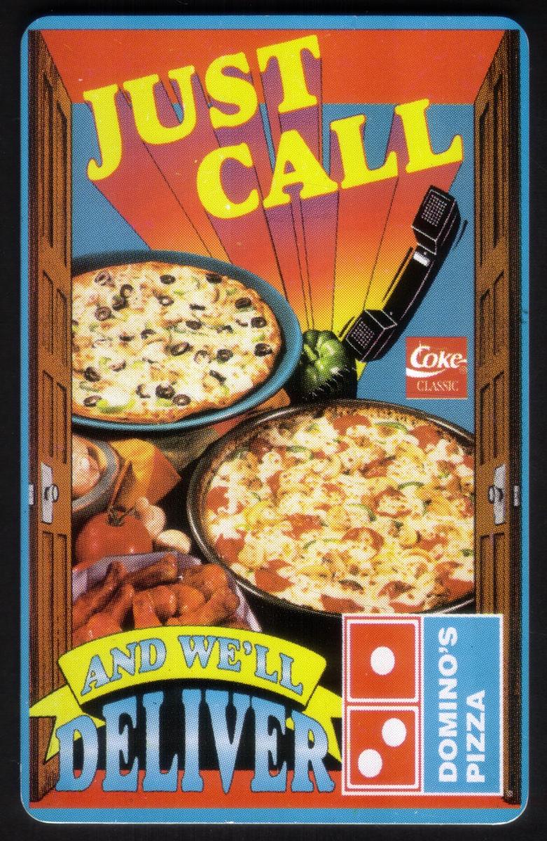 This collectible phone card features promotional branding from Domino’s Pizza alongside Coca-Cola logos. The card prominently displays the Domino’s Pizza logo in the upper right corner and includes the slogan “Just Call And We’ll Deliver” beneath the Domino’s Pizza name. A small Coca-Cola logo is positioned near the bottom of the card. The design incorporates a phone illustration, reinforcing the phone card’s function for telecommunications, with the Cable & Wireless (C&W) and Telenova logos also visible, indicating the telecommunication service providers.