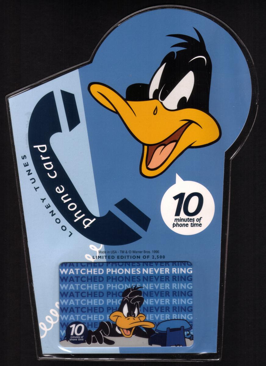 This collectible phone card features Daffy Duck, the iconic Warner Bros. cartoon character from Looney Tunes. The design showcases Daffy Duck dressed in a military helmet and uniform, with a serious expression on his face. The card’s artwork is in classic cartoon style, rooted firmly in animation and comics genres. The overall theme relates to the Looney Tunes series and specifically highlights Daffy Duck’s adventurous and comedic personality.