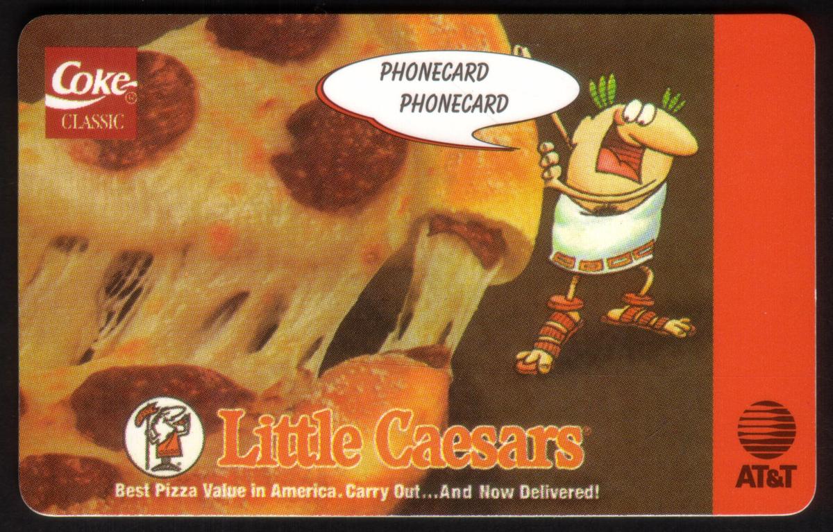 A speech bubble next to the Little Caesars character contains the text "PHONECARD PHONECARD" in uppercase letters, linking the card's phone card function with its promotional design. The card integrates the branding of Little Caesars, Coca-Cola, and AT&T into a single collectible item promoting fast food delivery and value.