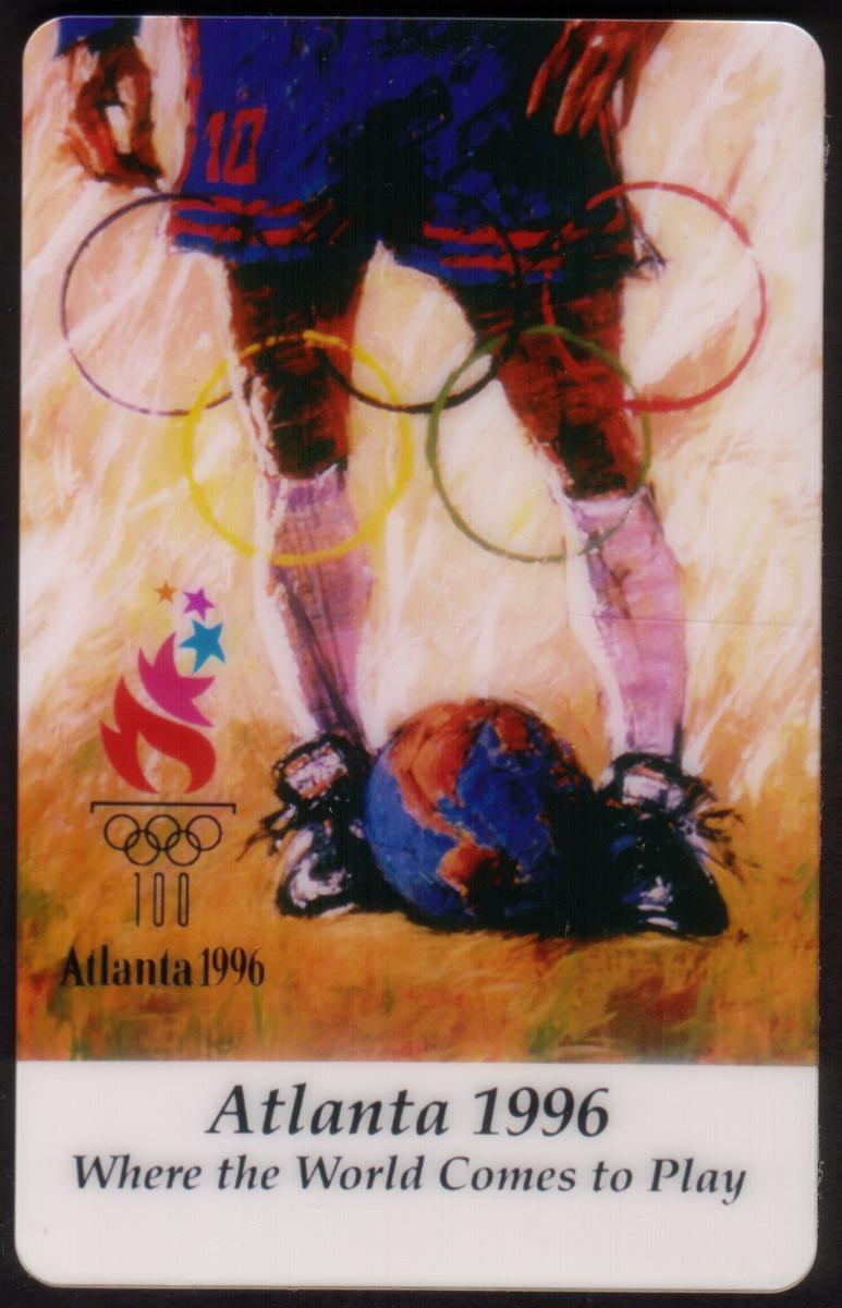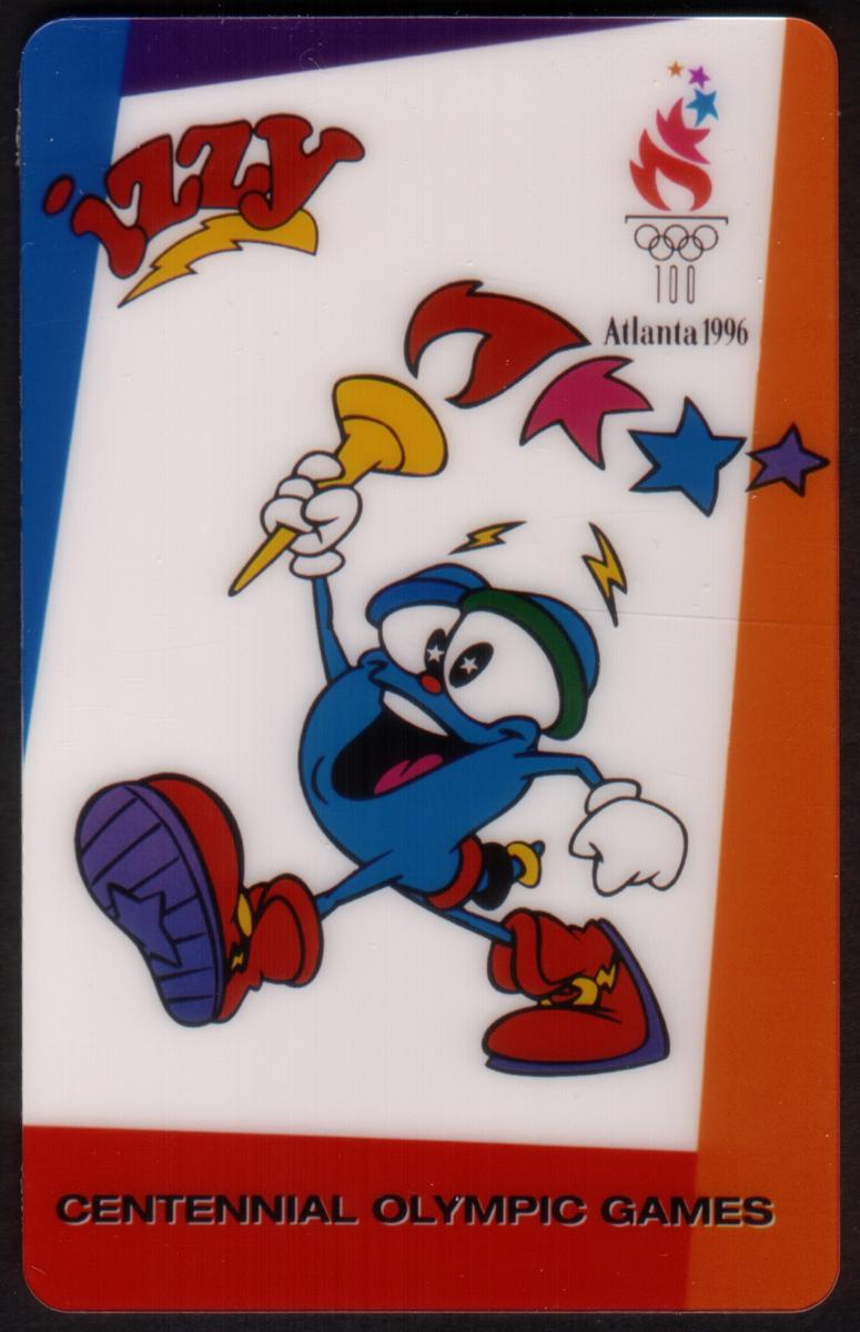 This collectible set includes four promotional collectible phone cards issued for the 1996 Atlanta Olympic Games, also known as the Centennial Olympiad. Each phone card features imagery related to soccer as part of the Olympic sports featured at the Atlanta Olympics. The artwork prominently displays Izzy, the official mascot of the 1996 Atlanta Olympic Games, depicted in vibrant colors. Izzy is shown engaging with a soccer ball, emphasizing the soccer theme within the Olympic context.