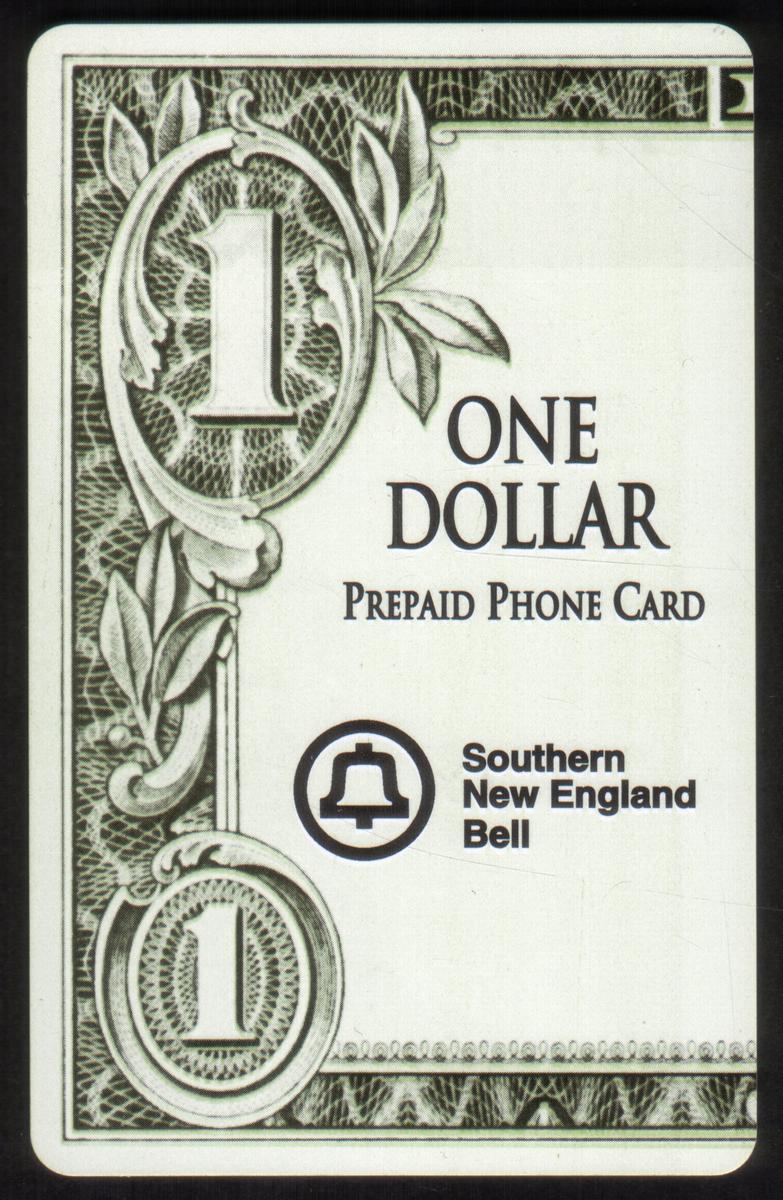 Text on the card includes references to "U.S. dollars," "money," and "US dollars," emphasizing the theme of American currency. Additionally, the card notes a connection to New England Telephone, as indicated by "So New Eng Tel : SNET." The term "WorldCom" appears as one word, linking it to the telecommunications company WorldCom, which historically had ties with SNET.