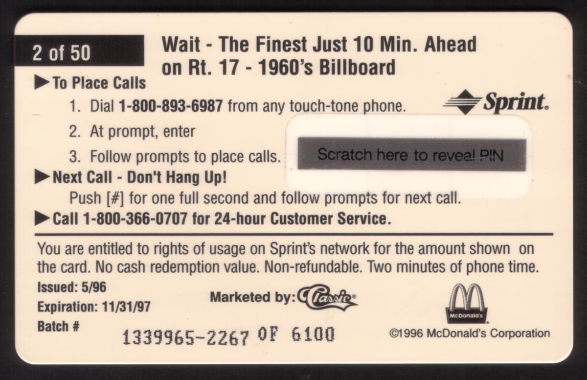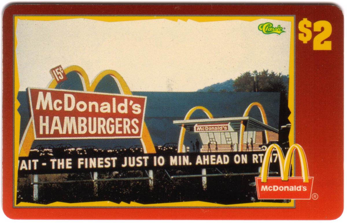 This phone card is part of the McDonald's 1996 series titled "The Finest Just 10 Minutes Ahead," and it is identified as number 2 of 50 in the Score Board (Classic) collection. It captures the nostalgic branding and imagery of McDonald’s from an earlier era, highlighting the chain’s historical marketing and customer appeal.