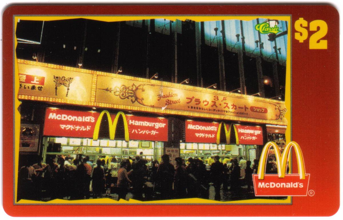 The design includes clear Japanese text, along with English text that identifies the location as Tokyo, Japan. The card’s visual focus is on the McDonald's brand, emphasizing its global reach and cultural integration in Japan. The background visuals and details center on McDonald's advertising and signage typical of urban Japanese settings, including the use of vibrant colors and signage styles found commonly in Tokyo's busy commercial areas.