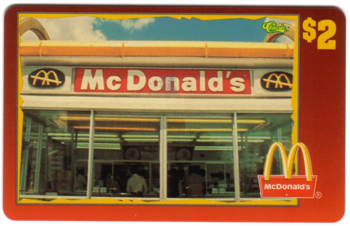Text on the card indicates its association with McDonald's and fast food chains, reinforcing its collectible nature related to restaurant memorabilia. The color scheme and layout reflect a standard collectible card from that time, focused on showcasing the specific McDonald's location in California.