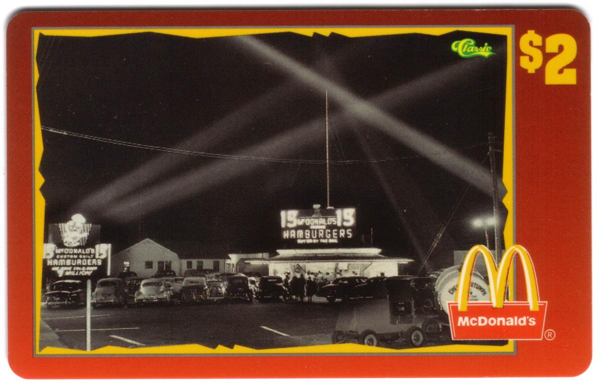 This collectible card features a nighttime scene of a McDonald’s restaurant illuminated by bright spotlights against a dark sky. The iconic Golden Arches logo appears prominently on the building, glowing with light. The McDonald’s signage is clearly visible on the facade, showcasing the brand’s recognizable colors of red and yellow.