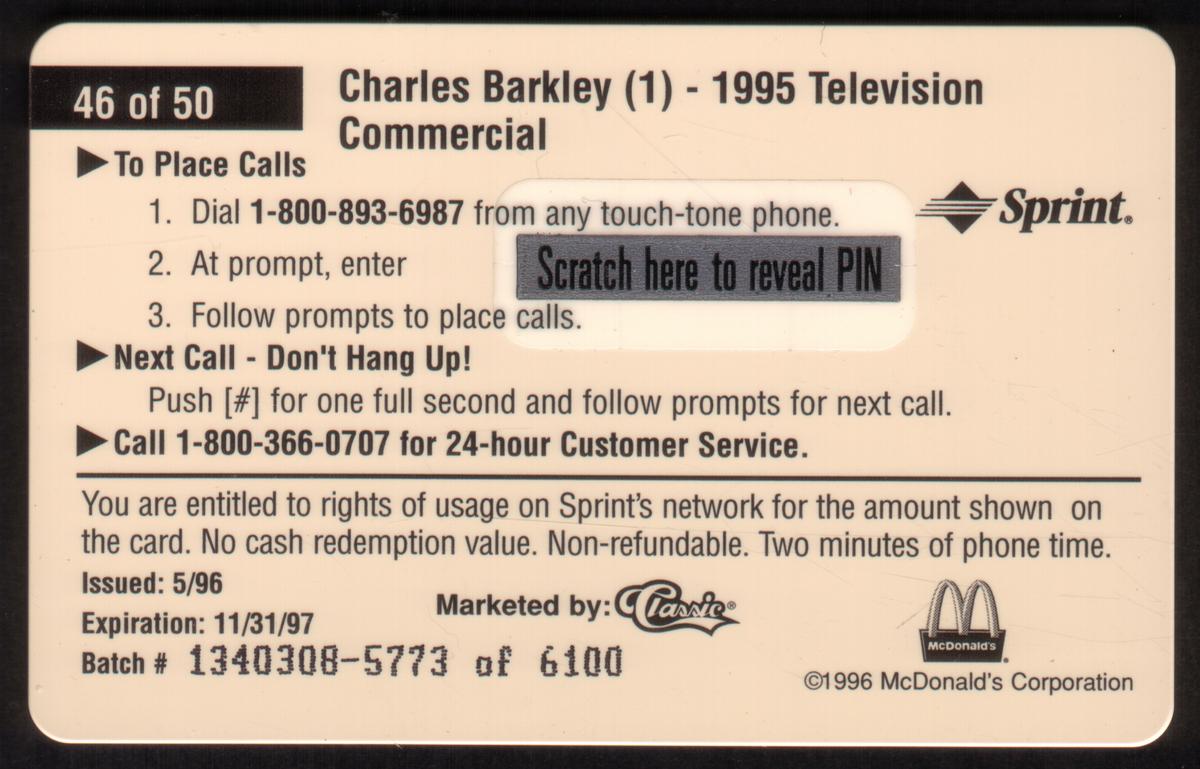 Vintage Charles Barkley collectible featuring bold imagery, vibrant colors, McDonald''s branding, and practical usage details for phone card collectors. |