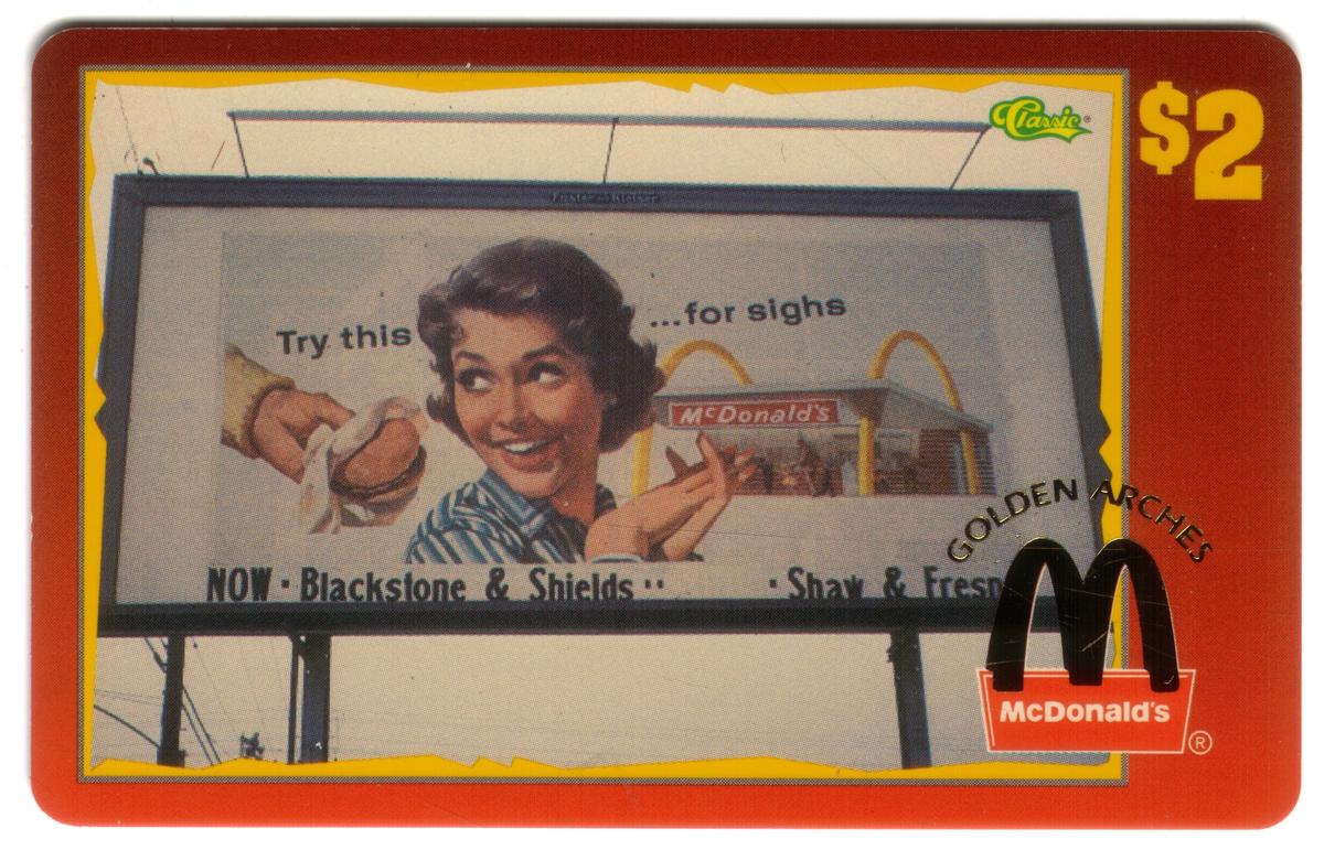 The card has a gold tone scoreboard design aligned with the “Classic” theme indicated in the description. The image captures the bold and recognizable branding style used by McDonald’s in their outdoor advertising during the mid-1990s. The combination of the highway sign and the Golden Arches logo emphasizes McDonald’s presence as a leading fast food chain and restaurant brand.