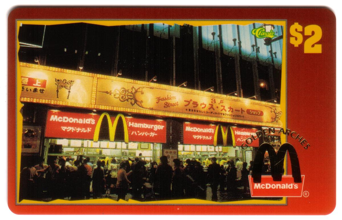This card is a part of a collection honoring McDonald’s presence and advertising in Tokyo, showcasing the brand’s global reach through a visual representation of its Japanese location. The card’s focus is on the restaurant’s signage and branding elements, highlighting McDonald’s role in the international fast food restaurant industry.