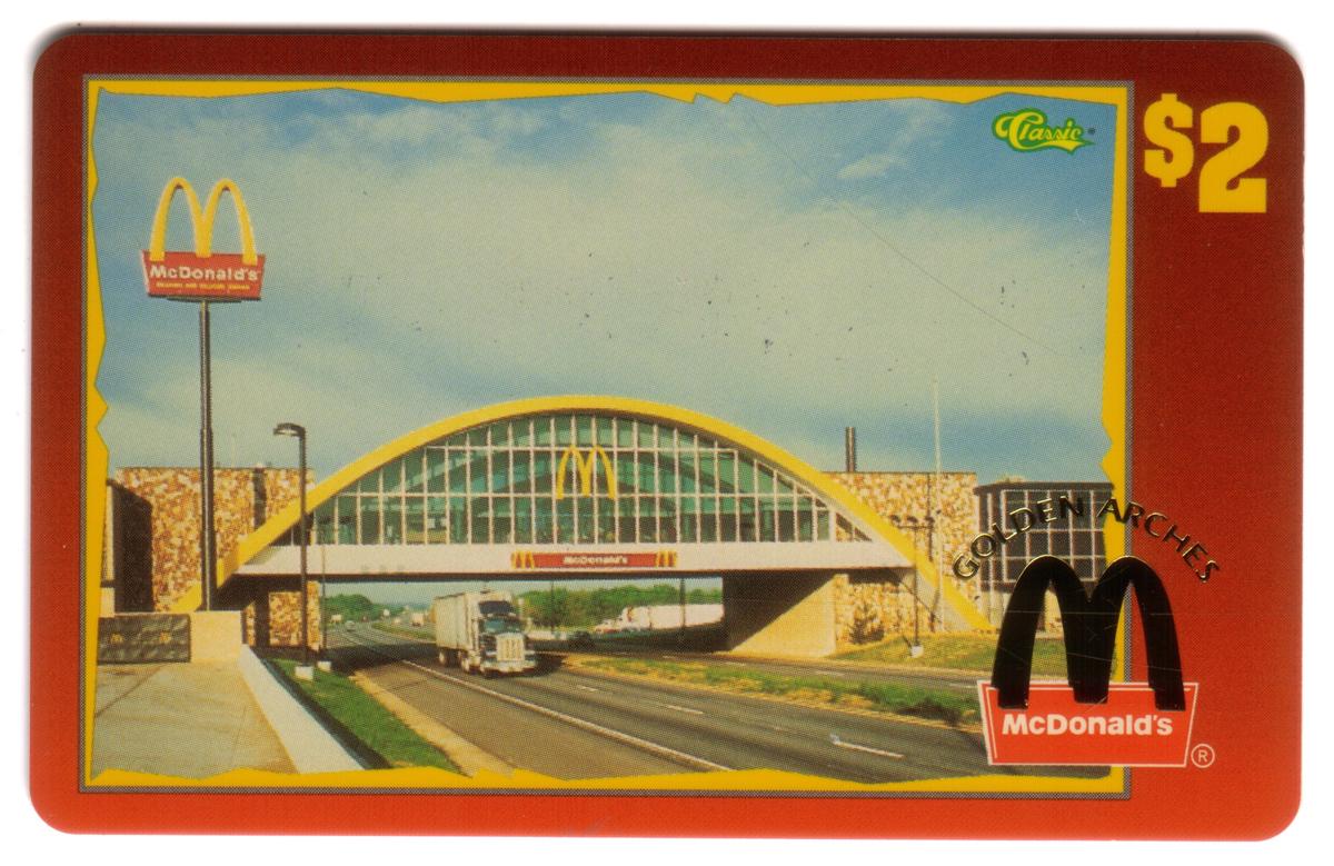 This collectible chip card is from McDonald’s and features a vintage 1996 design. It highlights the McDonald’s Over Highway theme with an image of a McDonald’s restaurant located beside an elevated highway. The scene includes the iconic Golden Arches prominently displayed above the restaurant. The setting appears to be in Oklahoma, as indicated by the text on the card.