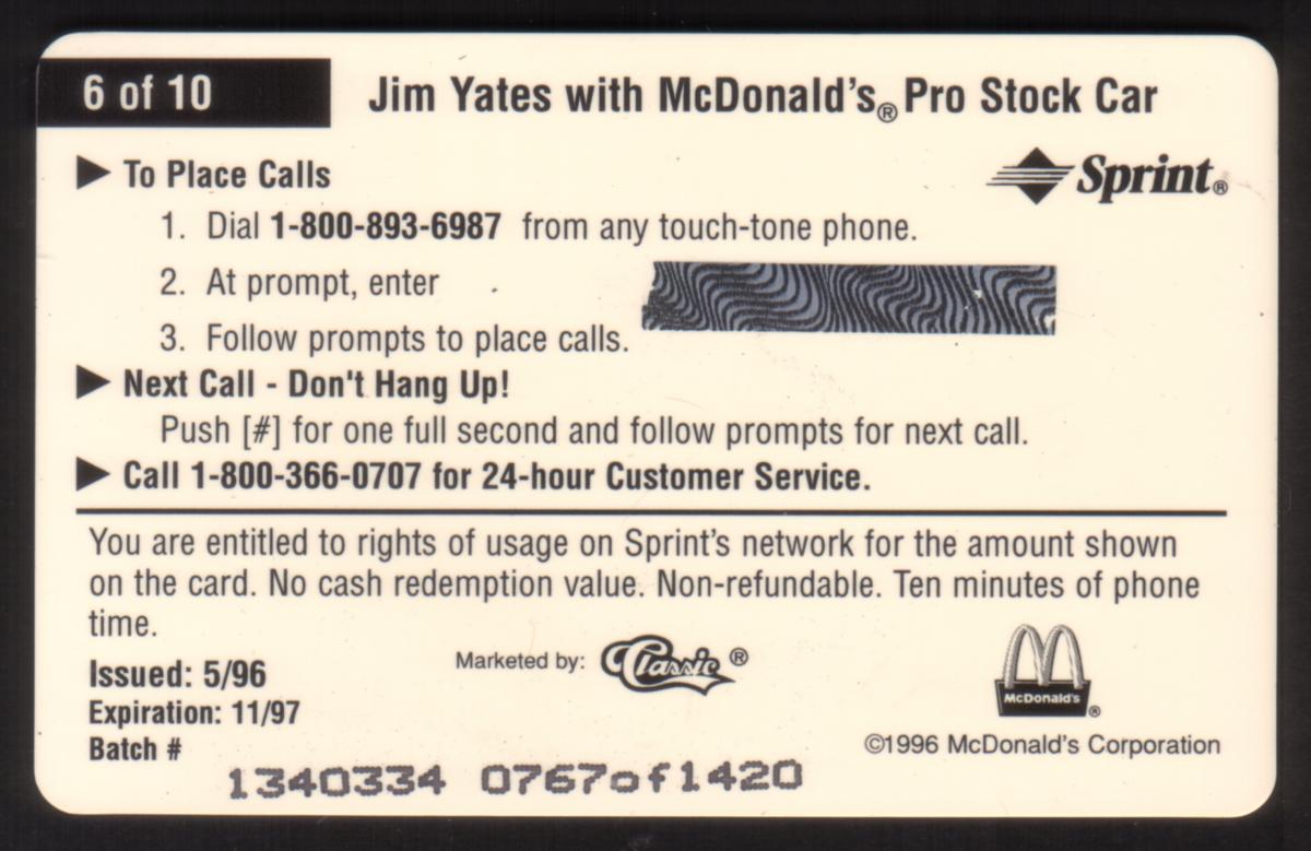 The card is produced by Classic and showcases a detailed image of the McDonald’s sponsored racing vehicle and driver, emphasizing the partnership between Jim Yates and the McDonald’s racing team during 1996. It is numbered #6 of 10 from the McDonald’s 1996 series commemorating this auto racing team.