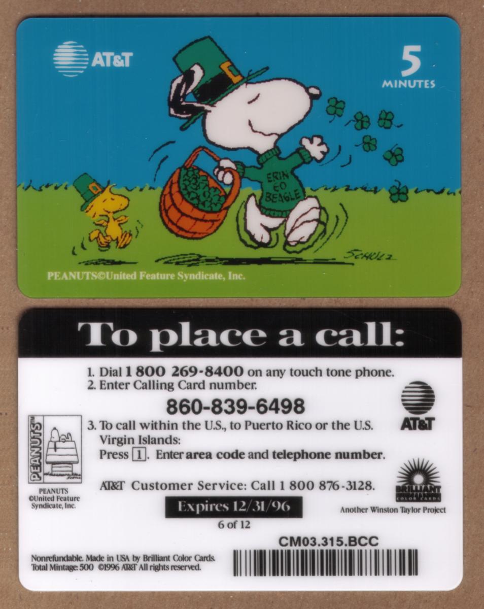 This collectible phone card features Snoopy and Woodstock from the Peanuts comic strip by Charles Schulz, celebrating St. Patrick's Day. Snoopy is dressed in a green outfit with a matching leprechaun hat and is happily tossing around several green four-leaf clovers. His shirt has the text "ERIN GO BEAGLE" printed on it. Woodstock is also wearing a small green hat and follows closely behind Snoopy. The background is a vibrant green field with a clear blue sky above.